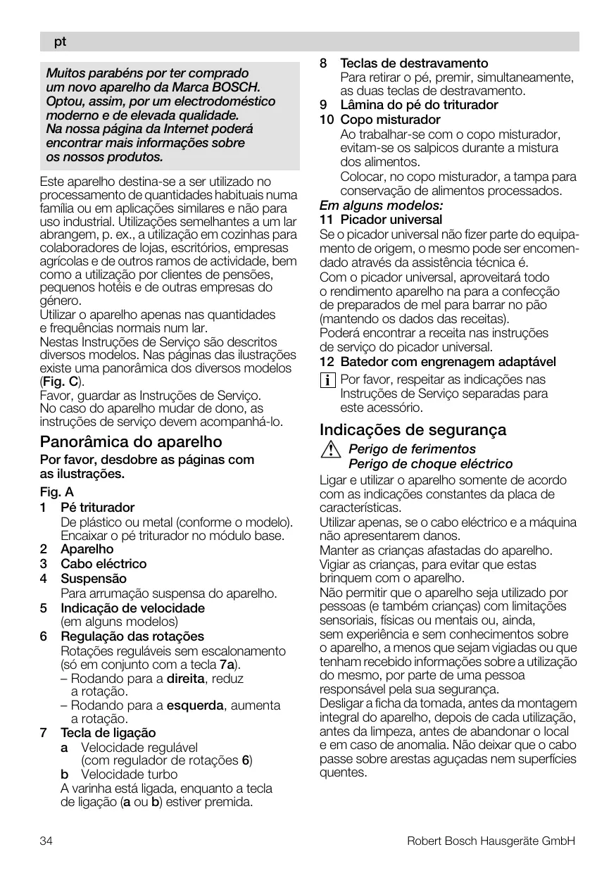 pt jìáíçë=é~ê~Ĩåë=éçê=íÉê=Åçãéê~Çç= ìã åçîç=~é~êÉäÜç=Ç~=j~êÅ~=_lp`eK léíçìI=~ëëáãI=éçê=ìã=ÉäÉÅíêçÇçã¨ëíáÅç= ãçÇÉêåç=É=ÇÉ=ÉäÉî~Ç~=èì~äáÇ~ÇÉK= k~ åçëë~ é•Öáå~=Ç~=fåíÉêåÉí=éçÇÉê•= ÉåÅçåíê~ê=ã~áë=áåÑçêã~´πÉë=ëçÄêÉ= çë åçëëçë=éêçÇìíçëK Este aparelho destina-se a ser utilizado no processamento de quantidades habituais numa família ou em aplicações similares e não para uso industrial. Utilizações semelhantes a um lar abrangem, p. ex., a utilização em cozinhas para colaboradores de lojas, escritórios, empresas agrícolas e de outros ramos de actividade, bem como a utilização por clientes de pensões, pequenos hotéis e de outras empresas do género. Utilizar o aparelho apenas nas quantidades e frequências normais num lar. Nestas Instruções de Serviço são descritos diversos modelos. Nas páginas das ilustrações existe uma panorâmica dos diversos modelos (Fig. C). Favor, guardar as Instruções de Serviço. No caso do aparelho mudar de dono, as instruções de serviço devem acompanhá-lo.