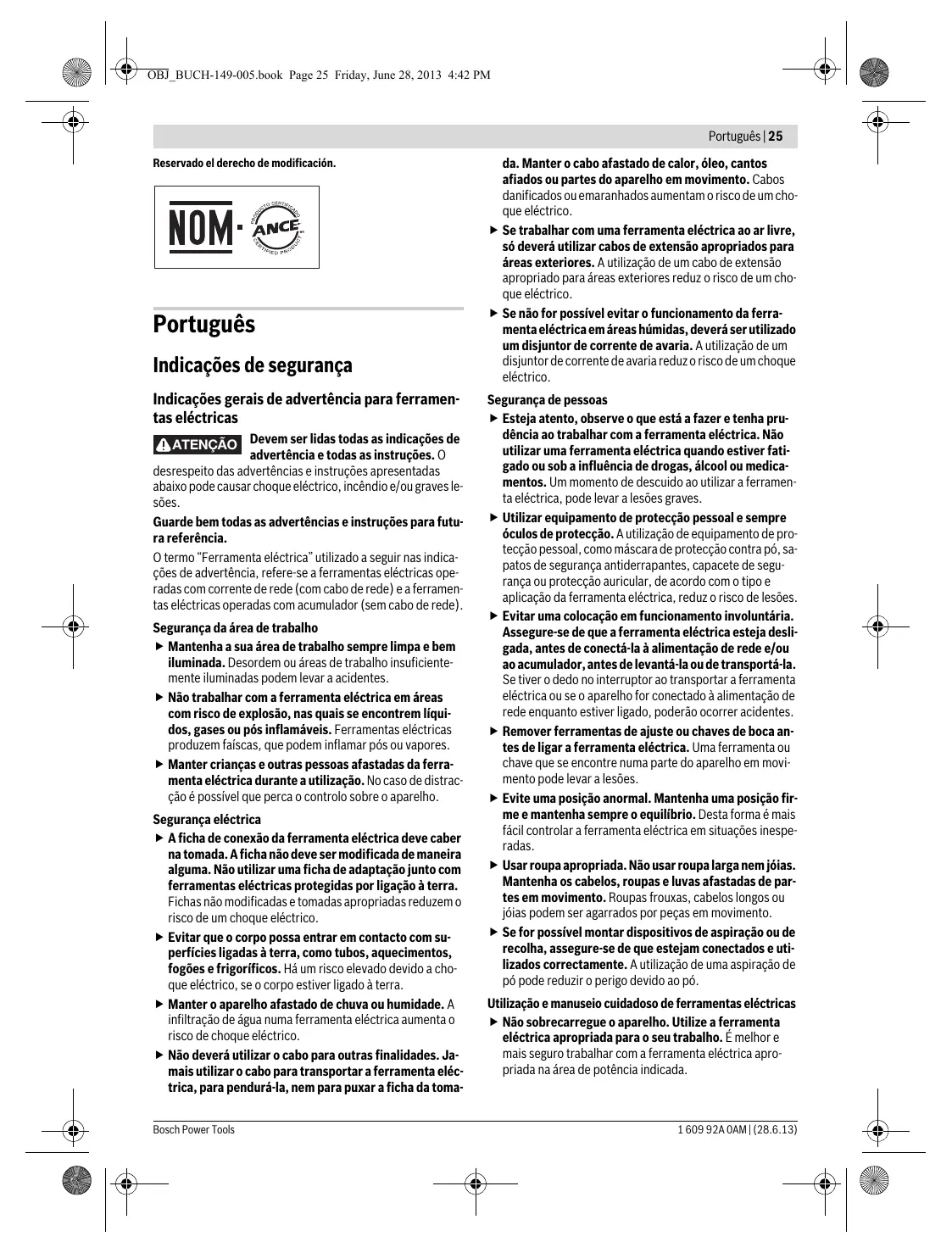 0,8–10 1,7 El acumulador viene equipado con un sensor de temperatura NTC que solamente admite su recarga dentro del margen de temperatura entre 0 °C y 45 °C. De esta manera se alcanza una larga vida útil del acumulador. Si después de una recarga, el tiempo de funcionamiento del acumulador fuese muy reducido, ello es señal de que éste está agotado y deberá sustituirse. Observe las indicaciones referentes a la eliminación. Cambio de útil (ver figura A) Antes de cualquier manipulación en la herramienta eléctrica (p.ej. en su mantenimiento, cambio de útil, etc.), así como al transportarla o guardarla, colocar en posición central el selector de sentido de giro. Vd. podría accidentarse en caso de un accionamiento fortuito del interruptor de conexión/desconexión. Sujete el casquillo posterior 3 del portabrocas de sujeción rápida 1 y gire el casquillo anterior 2 en el sentido , de manera que pueda insertarse el útil. Inserte el útil. Sujete el casquillo posterior 3 del portabrocas de sujeción rápida 1 y gire firmemente el casquillo anterior 2 en el sentido , hasta que perciba un clic. El portabrocas queda enclavado así de forma automática. Para desmontar el útil, es preciso desenclavar el portabrocas girando el casquillo anterior 2 en sentido contrario. Cambio del portabrocas En las herramientas eléctricas que no incorporen una retención del husillo para taladrar deberá hacerse sustituir el portabrocas en un servicio técnico autorizado para herramientas eléctricas Bosch. Bosch Power Tools OBJ_BUCH-149-005.book Page 23 Friday, June 28, 2013 4:42 PM Español | 23 El portabrocas deberá apretarse con un par de apriete aprox. de 30–35 Nm. Aspiración de polvo y virutas El polvo de ciertos materiales como, pinturas que contengan plomo, ciertos tipos de madera y algunos minerales y metales, puede ser nocivo para la salud. El contacto y la inspiración de estos polvos pueden provocar en el usuario o en las personas circundantes reacciones alérgicas y/o enfermedades respiratorias. Ciertos polvos como los de roble, encina y haya son considerados como cancerígenos, especialmente en combinación con los aditivos para el tratamiento de la madera (cromatos, conservantes de la madera). Los materiales que contengan amianto solamente deberán ser procesados por especialistas. – Observe que esté bien ventilado el puesto de trabajo. – Se recomienda una mascarilla protectora con un filtro de la clase P2. Observe las prescripciones vigentes en su país sobre los materiales a trabajar. Evite acumulaciones de polvo en el puesto de trabajo. Los materiales en polvo se pueden inflamar fácilmente. Operación Puesta en marcha Montaje del acumulador Solamente utilice bloques de acumuladores O, originales Bosch, de la tensión indicada en la placa de características de su herramienta eléctrica. El uso de otro tipo de acumuladores puede provocar daños e incluso un incendio. Colocar el selector del sentido de giro 11 en la posición central para evitar una conexión involuntaria. Insertar el acumulador 9 cargado en la empuñadura hasta que enclave de manera perceptible y quede enrasado con la empuñadura. Ajuste del sentido de giro (ver figura B) Con el selector 11 puede invertirse el sentido de giro actual de la herramienta eléctrica. Esto no es posible, sin embargo, con el interruptor de conexión/desconexión 12 accionado. Giro a derechas: Para taladrar y enroscar tornillos presionar hasta el tope hacia la izquierda el selector de sentido de giro 11. El indicador de sentido de giro a derechas 5 se enciende al estar accionado el interruptor de conexión/desconexión 12. Giro a izquierdas: Para aflojar y desenroscar tornillos presionar hasta el tope hacia la derecha el selector de sentido de giro El indicador de sentido de giro a izquierdas 6 se enciende al estar accionado el interruptor de conexión/desconexión 12. ajuste es correcto, el útil se detiene en el momento en que la cabeza del tornillo quede enrasada con el material, o bien, al alcanzarse el par de giro ajustado. Al desenroscar tornillos, puede que sea necesario ajustar un nivel de par más alto, o bien, seleccione el símbolo “Taladrar”. Taladrar En la posición “Taladrar” se desactiva el embrague limitador. Conexión/desconexión Para la puesta en marcha de la herramienta eléctrica accionar y mantener en esa posición el interruptor de conexión/ desconexión 12. La bombilla 10 se enciende al presionar hasta la mitad, o completamente, el interruptor de conexión/desconexión 12, lo que permite iluminar el punto de atornillado en lugares con poca luz. Para desconectar la herramienta eléctrica soltar el interruptor de conexión/desconexión 12. Ajuste de las revoluciones Variando la presión ejercida sobre el interruptor de conexión/ desconexión 12 puede Ud. regular de forma continua las revoluciones de la herramienta eléctrica. Apretando levemente el interruptor de conexión/desconexión 12 se obtienen unas revoluciones bajas. Incrementando paulatinamente la presión van aumentando las revoluciones en igual medida. Freno de marcha por inercia Al soltar el interruptor de conexión/desconexión 12 se frena el portabrocas y con ello el útil que lleva montado. Antes de soltar el interruptor de conexión/desconexión 12, espere a que el tornillo haya sido enroscado al ras con la superficie de la pieza de trabajo. De esta manera se evita que la cabeza del tornillo penetre en el material. Instrucciones para la operación Solamente aplique la herramienta eléctrica desconectada contra el tornillo. Los útiles en rotación pueden resbalar. En caso de trabajar prolongadamente a bajas revoluciones deberá refrigerarse la herramienta eléctrica dejándola funcionar aprox. 3 minutos a las revoluciones en vacío máximas. Para taladrar en metal solamente usar brocas HSS (HSS=acero de corte rápido de alto rendimiento) bien afiladas y en perfecto estado. Brocas con la calidad correspondiente las encontrará en el 