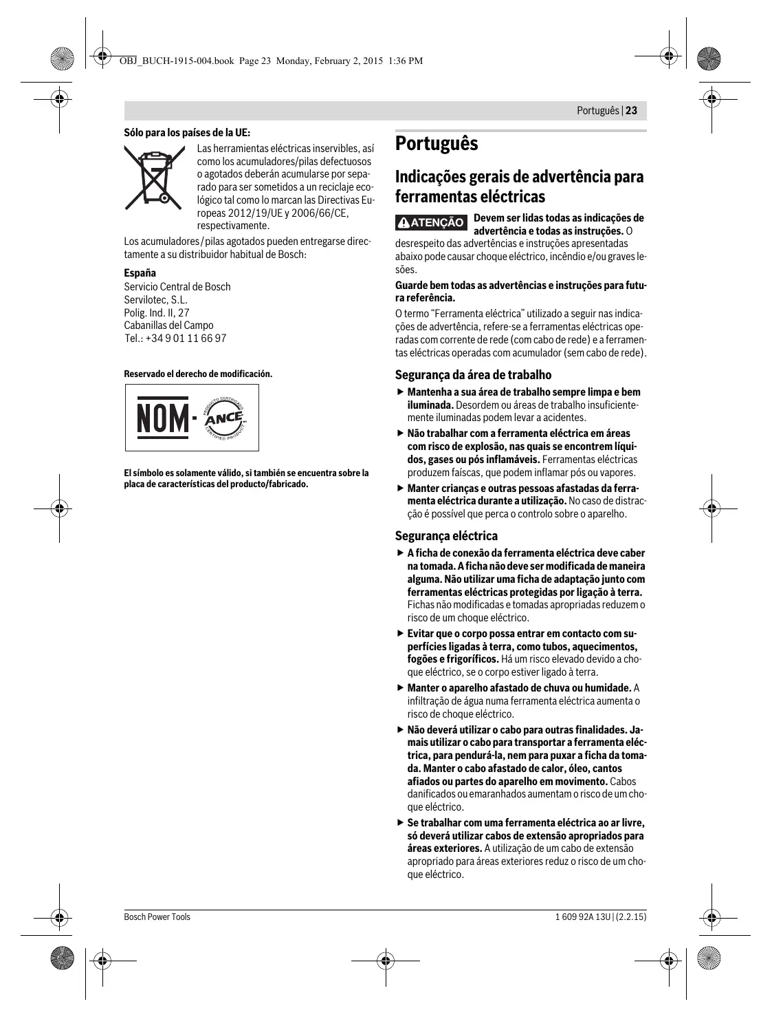 Mantenimiento y limpieza Mantenga limpia la herramienta eléctrica y las rejillas de refrigeración para trabajar con eficacia y seguridad. Servicio técnico y atención al cliente El servicio técnico le asesorará en las consultas que pueda Ud. tener sobre la reparación y mantenimiento de su producto, así como sobre piezas de recambio. Los dibujos de despiece e informaciones sobre las piezas de recambio los podrá obtener también en internet bajo: www.bosch-pt.com Nuestro equipo de asesores técnicos le orientará gustosamente en cuanto a la adquisición, aplicación y ajuste de los productos y accesorios. Para cualquier consulta o pedido de piezas de repuesto es imprescindible indicar el nº de artículo de 10 dígitos que figura en la placa de características de la herramienta eléctrica. España Robert Bosch Espana S.L.U. Departamento de ventas Herramientas Eléctricas C/Hermanos García Noblejas, 19 28037 Madrid Para efectuar su pedido online de recambios o pedir la recogida para la reparación de su máquina, entre en la página www.herramientasbosch.net. Tel. Asesoramiento al cliente: 902 531 553 Fax: 902 531554 1 609 92A 13U | (2.2.15) Venezuela Robert Bosch S.A. Final Calle Vargas. Edf. Centro Berimer P.B. Boleita Norte Caracas 107 Tel.: (0212) 2074511 México Robert Bosch S. de R.L. de C.V. Calle Robert Bosch No. 405 C.P. 50071 Zona Industrial, Toluca - Estado de México Tel. Interior: (01) 800 6271286 Tel. D.F.: 52843062 E-Mail: arturo.fernandez@mx.bosch.com Argentina Robert Bosch Argentina S.A. Av. Córdoba 5160 C1414BAW Ciudad Autónoma de Buenos Aires Atención al Cliente Tel.: (0810) 5552020 E-Mail: herramientas.bosch@ar.bosch.com Perú Robert Bosch S.A.C. Av. Primavera 781, Urb. Chacarilla, San Borja (Edificio Aldo) Buzón Postal Lima 41 - Lima Tel.: (01) 2190332 Chile Robert Bosch S.A. Calle El Cacique 0258 Providencia – Santiago Tel.: (02) 2405 5500 Transporte Los acumuladores de iones de litio incorporados están sujetos a los requerimientos estipulados en la legislación sobre mercancías peligrosas. Los acumuladores pueden ser transportados por carretera por el usuario sin más imposiciones. En el envío por terceros (p. ej., transporte aéreo o por agencia de transportes) deberán considerarse las exigencias especiales en cuanto a su embalaje e identificación. En este caso deberá recurrirse a los servicios de un experto en mercancías peligrosas al preparar la pieza para su envío. Únicamente envíe acumuladores si su carcasa no está dañada. Si los contactos no van protegidos cúbralos con cinta adhesiva y embale el acumulador de manera que éste no se pueda mover dentro del embalaje. Observe también las prescripciones adicionales que pudieran existir al respecto en su país. Eliminación Las herramientas eléctricas, acumuladores, accesorios y embalajes deberán someterse a un proceso de recuperación que respete el medio ambiente. ¡No arroje las herramientas eléctricas, acumuladores o pilas a la basura! Bosch Power Tools OBJ_BUCH-1915-004.book Page 23 Monday, February 2, 2015 1:36 PM Português | 23 Sólo para los países de la UE: Las herramientas eléctricas inservibles, así como los acumuladores/pilas defectuosos o agotados deberán acumularse por separado para ser sometidos a un reciclaje ecológico tal como lo marcan las Directivas Europeas 2012/19/UE y 2006/66/CE, respectivamente. Los acumuladores/pilas agotados pueden entregarse directamente a su distribuidor habitual de Bosch: España Servicio Central de Bosch Servilotec, S.L. Polig. Ind. II, 27 Cabanillas del Campo Tel.: +34 9 01 11 66 97 Reservado el derecho de modificación. El símbolo es solamente válido, si también se encuentra sobre la placa de características del producto/fabricado. Português Indicações gerais de advertência para ferramentas eléctricas ATENÇÃO Devem ser lidas todas as indicações de advertência e todas as instruções. O desrespeito das advertências e instruções apresentadas abaixo pode causar choque eléctrico, incêndio e/ou graves lesões. Guarde bem todas as advertências e instruções para futura referência. O termo “Ferramenta eléctrica” utilizado a seguir nas indicações de advertência, refere-se a ferramentas eléctricas operadas com corrente de rede (com cabo de rede) e a ferramentas eléctricas operadas com acumulador (sem cabo de rede). Segurança da área de trabalho Mantenha a sua área de trabalho sempre limpa e bem iluminada. Desordem ou áreas de trabalho insuficientemente iluminadas podem levar a acidentes. Não trabalhar com a ferramenta eléctrica em áreas com risco de explosão, nas quais se encontrem líquidos, gases ou pós inflamáveis. Ferramentas eléctricas produzem faíscas, que podem inflamar pós ou vapores. Manter crianças e outras pessoas afastadas da ferramenta eléctrica durante a utilização. No caso de distracção é possível que perca o controlo sobre o aparelho. Segurança eléctrica A ficha de conexão da ferramenta eléctrica deve caber na tomada. A ficha não deve ser modificada de maneira alguma. Não utilizar uma ficha de adaptação junto com ferramentas eléctricas protegidas por ligação à terra. Fichas não modificadas e tomadas apropriadas reduzem o risco de um choque eléctrico. Evitar que o corpo possa entrar em contacto com superfícies ligadas à terra, como tubos, aquecimentos, fogões e frigoríficos. Há um risco elevado devido a choque eléctrico, se o corpo estiver ligado à terra. Manter o aparelho afastado de chuva ou humidade. A infiltração de água numa ferramenta eléctrica aumenta o risco de choque eléctrico. Não deverá utilizar o cabo para outras finalidades. Jamais utilizar o cabo para transportar a ferramenta eléctrica, para pendurá-la, nem para puxar a ficha da tomada. Manter o cabo afastado de calor, óleo, cantos afiados ou partes do aparelho em movimento. Cabos danificados ou emaranhados aumentam o risco de um choque eléctrico. Se trabalhar com uma ferramenta 