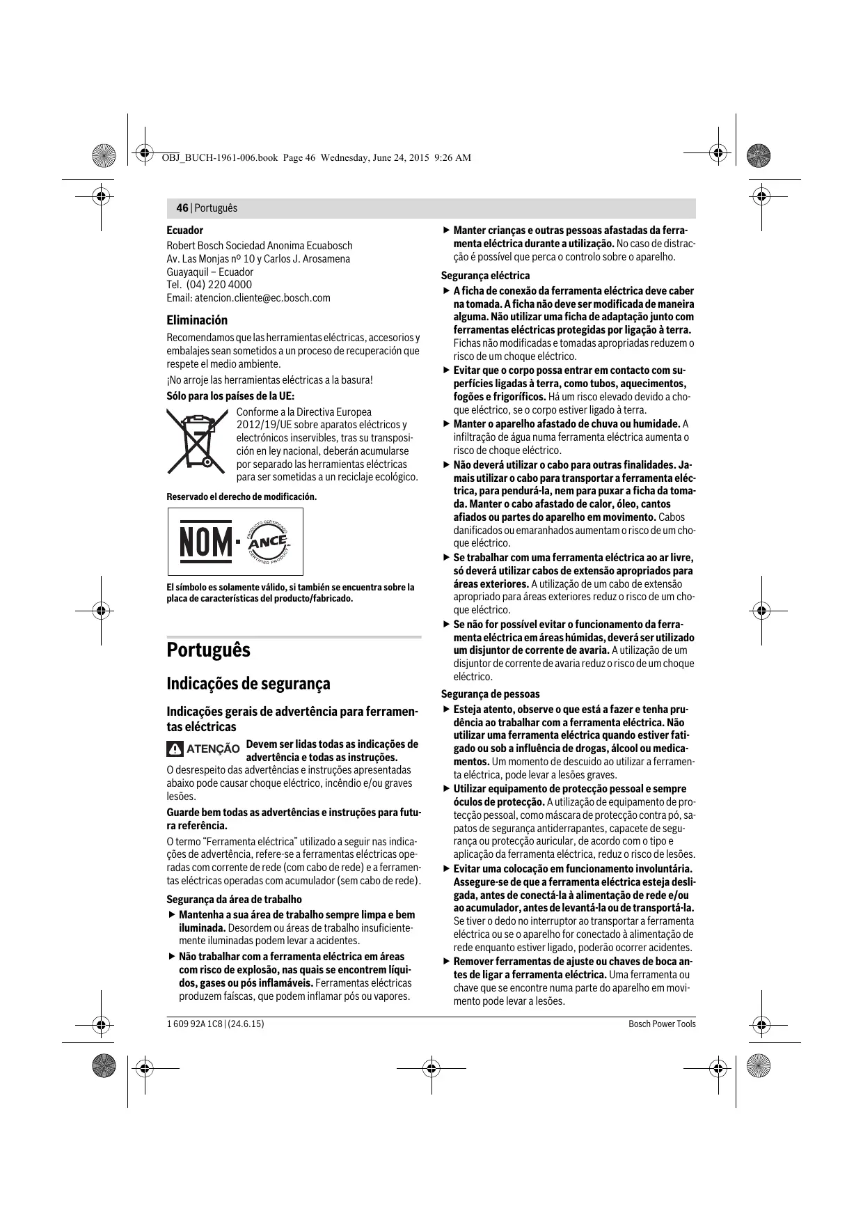 m/s2 m/s2 7,0 1,5 8,0 1,5 13,0 1,5 m/s2 m/s2 5,0 1,5 5,0 1,5 6,0 1,5 O nível de vibrações indicado nestas instruções foi medido de acordo com um processo de medição normalizado pela norma EN 60745 e pode ser utilizado para a comparação de ferramentas eléctricas. Ele também é apropriado para uma avaliação provisória da carga de vibrações. O nível de vibrações indicado representa as aplicações principais da ferramenta eléctrica. Se, contudo, a ferramenta eléctrica for utilizada para outras aplicações, com acessórios diferentes, com outras ferramentas de trabalho ou com manutenção insuficiente, é possível que o nível de vibrações seja diferente. Isto pode aumentar sensivelmente a carga de vibrações para o período completo de trabalho. Para uma estimação exacta da carga de vibrações, também deveriam ser considerados os períodos nos quais o aparelho está desligado ou funciona, mas não está sendo utilizado. Isto pode reduzir a carga de vibrações durante o completo período de trabalho. Além disso também deverão ser estipuladas medidas de segurança para proteger o operador contra o efeito de vibrações, como por exemplo: manutenção de ferramentas eléctricas e de ferramentas de trabalho, manter as mãos quentes e organização dos processos de trabalho. Henk Becker Executive Vice President Engineering Declaração de conformidade Capa de protecção para lixar Colocar a capa de protecção 7 sobre a fixação da ferramenta eléctrica, até os ressaltos de codificação da capa de cobertura coincidirem com a fixação. Premir e segurar ao mesmo tempo a alavanca de desbloqueio 1. Premir a capa de protecção 7 sobre a gola do veio, até o colar da capa de protecção estar assentado no flange da ferramenta eléctrica e girar a capa de protecção até que engate perceptivelmente. Declaramos sob nossa inteira responsabilidade que o produto descrito nos “Dados técnicos” está em conformidade com todas as disposições pertinentes das Directivas 2011/65/UE, até 19 de Abril de 2016: 2004/108/CE, a partir de 20 de Abril de 2016: 2014/30/UE, 2006/42/CE incluindo suas alterações, e em conformidade com as seguintes normas: EN 60745-1, EN 60745-2-3. Processo técnico (2006/42/CE) em: Robert Bosch GmbH, PT/ETM9, 70764 Leinfelden-Echterdingen, GERMANY Bosch Power Tools Helmut Heinzelmann Head of Product Certification PT/ETM9 Robert Bosch GmbH, Power Tools Division 70764 Leinfelden-Echterdingen, GERMANY Leinfelden, 24.06.2015 Montagem Montar os dispositivos de protecção Antes de todos trabalhos na ferramenta eléctrica deverá puxar a ficha de rede da tomada. Nota: Se o disco abrasivo quebrar durante o funcionamento ou se os dispositivos de fixação na capa de protecção/na ferramenta eléctrica estiverem danificados, será necessário que a ferramenta eléctrica seja enviada imediatamente ao serviço pós-venda, os endereços encontram-se na secção “Serviço pós-venda e consultoria de aplicação”. 1 609 92A 1C8 | (24.6.15) OBJ_BUCH-1961-006.book Page 52 Wednesday, June 24, 2015 9:26 AM 52 | Português Adaptar a posição da capa de protecção 7 às exigências do processo de trabalho. Para tal, deverá premir a alavanca de destravamento 1 para cima e girar a capa de protecção 7 para a posição desejada. Sempre ajustar a capa de protecção 7, de modo que todos os 3 ressaltos vermelhos da alavanca de destravamento 1 engatem nos respectivos entalhes da capa de protecção 7. Ajustar a capa de protecção 7 de modo a evitar que voem faúlhas na direcção do operador. Só deverá ser possível girar a capa de protecção 7, accionando também a alavanca de destravamento 1! Caso contrário, não deverá de modo algum continuar a utilizar a ferramenta eléctrica, mas enviá-la ao serviço pós-venda. Nota: Os ressaltos de codificação na capa de protecção 7 garantem que só possa ser montada uma capa de protecção apropriada para a ferramenta eléctrica. Capa de protecção para cortar Ao cortar com rebolos ligados deve ser sempre utilizada uma capa de protecção para cortar 12. Ao cortar pedras deve ser sempre assegurada uma aspiração de pó suficiente. A capa de protecção para cortar 12 é montada como a capa de protecção para lixar 7. Capa de aspiração para cortar com carril de guia A capa de aspiração para cortar com carril de guia 19 é montada como a capa de protecção para lixar 7. Punho adicional Só utilizar a sua ferramenta eléctrica com o punho adicional 5. Atarraxar o punho adicional 5 de acordo com o tipo de trabalho, do lado direito ou do lado esquerdo do cabeçote de engrenagens. Protecção para as mãos Ao trabalhar com o prato abrasivo de borracha 15 ou com a escova tipo tacho/escova plana/disco abrasivo em forma de leque deverá sempre montar a protecção para as mãos 14. Fixar a protecção para as mãos 14 com o punho adicional 5. Montar ferramentas abrasivas Antes de todos trabalhos na ferramenta eléctrica deverá puxar a ficha de rede da tomada. Não tocar em rebolos e discos de corte antes de esfriarem. Os discos se tornam bem quentes durante o trabalho. Limpar o veio de rectificação 6 e todas as peças a serem montadas. Premir a tecla de bloqueio do veio 2 para prender e soltar as ferramentas abrasivas e para imobilizar o veio de rectificação. Só accionar a tecla de bloqueio do veio com o veio de rectificação parado. Caso contrário é possível que a ferramenta eléctrica seja danificada. 1 609 92A 1C8 | (24.6.15) Disco abrasivo/de corte Observe as dimensões das ferramentas abrasivas. O diâmetro do furo deve ser do tamanho certo para o flange de admissão. Não utilizar adaptadores nem redutores. Ao utilizar discos de corte diamantados deverá assegurar-se de que a seta do sentido de rotação sobre o disco de corte diamantado coincida com o sentido de rotação da ferramenta eléctrica (veja seta do sentido de rotação sobre o cabeçote de engrenagens). A sequência de montagem 
