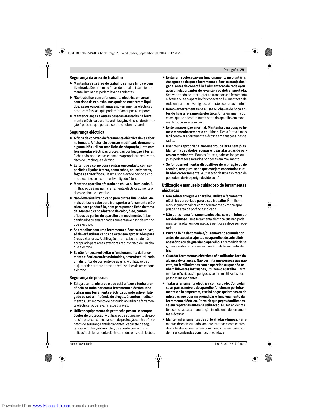 m/s2 m/s2 2,5 1,5 4,0 1,5 Bosch Power Tools OBJ_BUCH-1549-004.book Page 33 Wednesday, September 10, 2014 7:12 AM Português | 33 O nível de vibrações indicado nestas instruções foi medido de acordo com um processo de medição normalizado pela norma EN 60745 e pode ser utilizado para a comparação de ferramentas eléctricas. Ele também é apropriado para uma avaliação provisória da carga de vibrações. O nível de vibrações indicado representa as aplicações principais da ferramenta eléctrica. Se, contudo, a ferramenta eléctrica for utilizada para outras aplicações, com acessórios diferentes, com outras ferramentas de trabalho ou com manutenção insuficiente, é possível que o nível de vibrações seja diferente. Isto pode aumentar sensivelmente a carga de vibrações para o período completo de trabalho. Para uma estimação exacta da carga de vibrações, também deveriam ser considerados os períodos nos quais o aparelho está desligado ou funciona, mas não está sendo utilizado. Isto pode reduzir a carga de vibrações durante o completo período de trabalho. Além disso também deverão ser estipuladas medidas de segurança para proteger o operador contra o efeito de vibrações, como por exemplo: manutenção de ferramentas eléctricas e de ferramentas de trabalho, manter as mãos quentes e organização dos processos de trabalho. Declaração de conformidade
