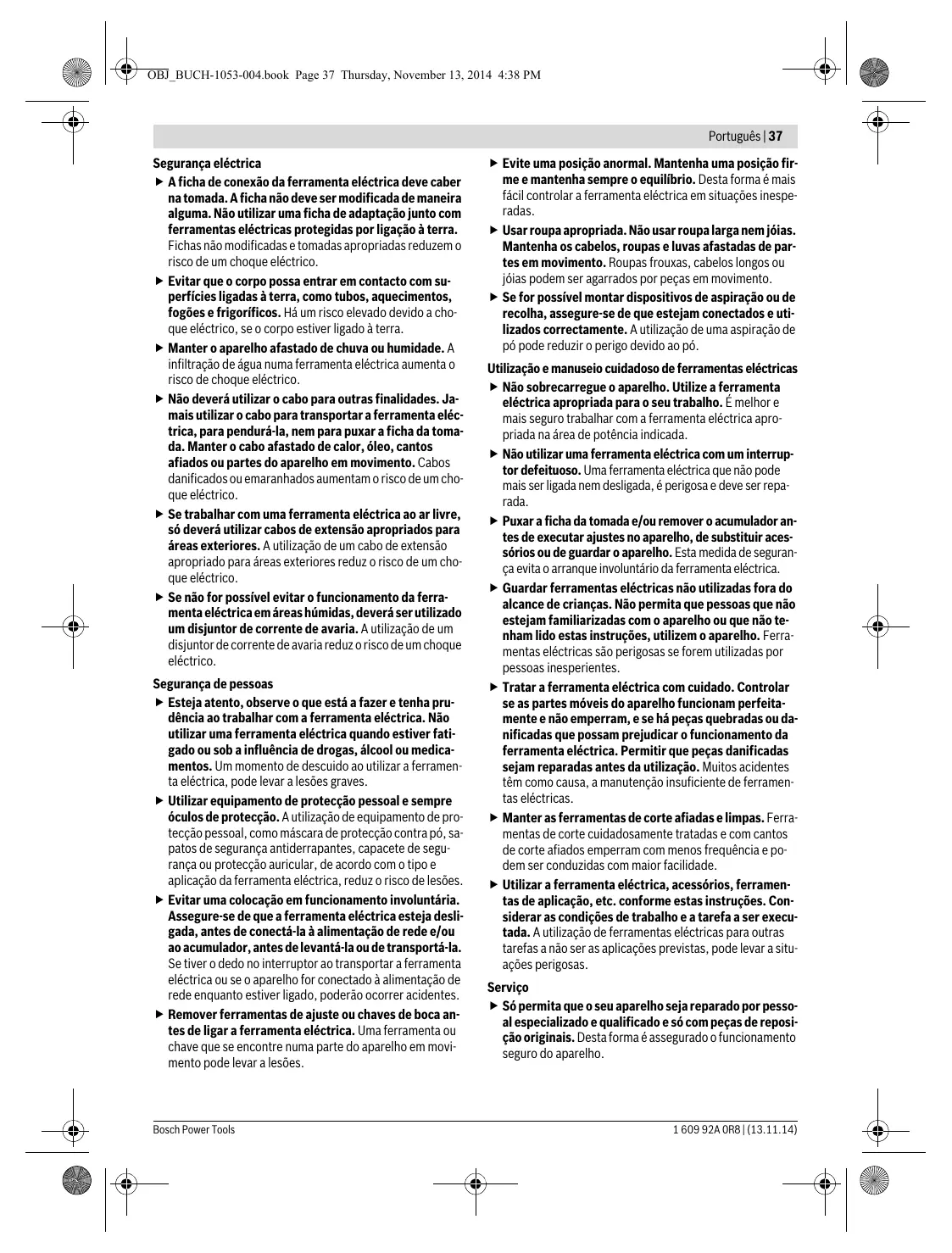 OBJ_BUCH-1053-004.book Page 37 Thursday, November 13, 2014 4:38 PM Português | 37 Segurança eléctrica A ficha de conexão da ferramenta eléctrica deve caber na tomada. A ficha não deve ser modificada de maneira alguma. Não utilizar uma ficha de adaptação junto com ferramentas eléctricas protegidas por ligação à terra. Fichas não modificadas e tomadas apropriadas reduzem o risco de um choque eléctrico. Evitar que o corpo possa entrar em contacto com superfícies ligadas à terra, como tubos, aquecimentos, fogões e frigoríficos. Há um risco elevado devido a choque eléctrico, se o corpo estiver ligado à terra. Manter o aparelho afastado de chuva ou humidade. A infiltração de água numa ferramenta eléctrica aumenta o risco de choque eléctrico. Não deverá utilizar o cabo para outras finalidades. Jamais utilizar o cabo para transportar a ferramenta eléctrica, para pendurá-la, nem para puxar a ficha da tomada. Manter o cabo afastado de calor, óleo, cantos afiados ou partes do aparelho em movimento. Cabos danificados ou emaranhados aumentam o risco de um choque eléctrico. Se trabalhar com uma ferramenta eléctrica ao ar livre, só deverá utilizar cabos de extensão apropriados para áreas exteriores. A utilização de um cabo de extensão apropriado para áreas exteriores reduz o risco de um choque eléctrico. Se não for possível evitar o funcionamento da ferramenta eléctrica em áreas húmidas, deverá ser utilizado um disjuntor de corrente de avaria. A utilização de um disjuntor de corrente de avaria reduz o risco de um choque eléctrico. Segurança de pessoas Esteja atento, observe o que está a fazer e tenha prudência ao trabalhar com a ferramenta eléctrica. Não utilizar uma ferramenta eléctrica quando estiver fatigado ou sob a influência de drogas, álcool ou medicamentos. Um momento de descuido ao utilizar a ferramenta eléctrica, pode levar a lesões graves. Utilizar equipamento de protecção pessoal e sempre óculos de protecção. A utilização de equipamento de protecção pessoal, como máscara de protecção contra pó, sapatos de segurança antiderrapantes, capacete de segurança ou protecção auricular, de acordo com o tipo e aplicação da ferramenta eléctrica, reduz o risco de lesões. Evitar uma colocação em funcionamento involuntária. Assegure-se de que a ferramenta eléctrica esteja desligada, antes de conectá-la à alimentação de rede e/ou ao acumulador, antes de levantá-la ou de transportá-la. Se tiver o dedo no interruptor ao transportar a ferramenta eléctrica ou se o aparelho for conectado à alimentação de rede enquanto estiver ligado, poderão ocorrer acidentes. Remover ferramentas de ajuste ou chaves de boca antes de ligar a ferramenta eléctrica. Uma ferramenta ou chave que se encontre numa parte do aparelho em movimento pode levar a lesões.