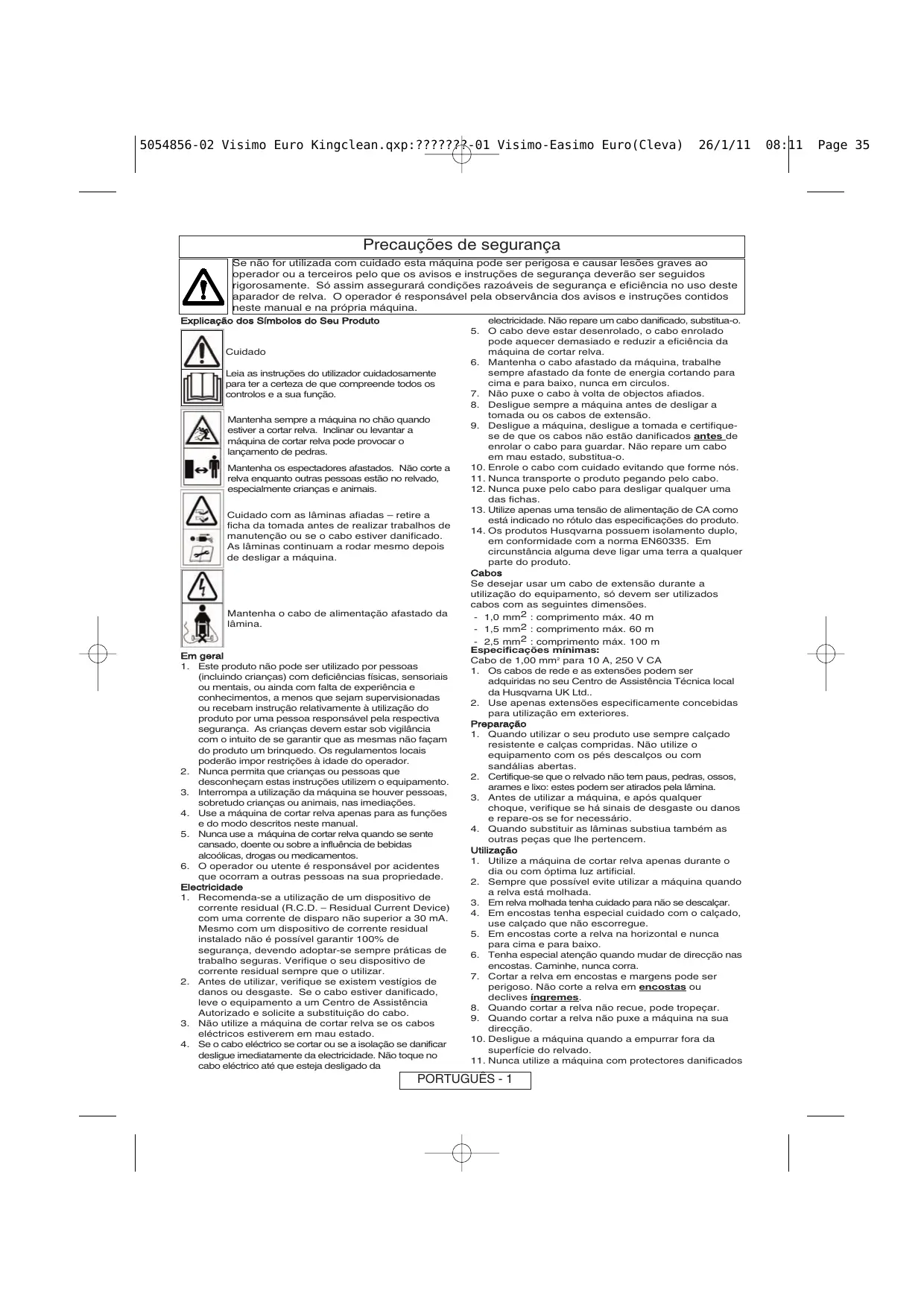 08:11 Page 34 5054856-02 Visimo Euro Kingclean.qxp:???????-01 Visimo-Easimo Euro(Cleva) 26/1/11 Precauções de segurança Se não for utilizada com cuidado esta máquina pode ser perigosa e causar lesões graves ao operador ou a terceiros pelo que os avisos e instruções de segurança deverão ser seguidos rigorosamente. Só assim assegurará condições razoáveis de segurança e eficiência no uso deste aparador de relva. O operador é responsável pela observância dos avisos e instruções contidos neste manual e na própria máquina. Explicação dos Símbolos do Seu Produto Cuidado Leia as instruções do utilizador cuidadosamente para ter a certeza de que compreende todos os controlos e a sua função. Mantenha sempre a máquina no chão quando estiver a cortar relva. Inclinar ou levantar a máquina de cortar relva pode provocar o lançamento de pedras. Mantenha os espectadores afastados. Não corte a relva enquanto outras pessoas estão no relvado, especialmente crianças e animais. Cuidado com as lâminas afiadas – retire a ficha da tomada antes de realizar trabalhos de manutenção ou se o cabo estiver danificado. As lâminas continuam a rodar mesmo depois de desligar a máquina. Mantenha o cabo de alimentação afastado da lâmina. Em geral