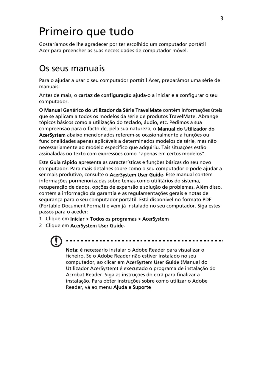 Note: é necessário instalar o Adobe Reader para visualizar o ficheiro. Se o Adobe Reader não estiver instalado no seu computador, ao fazer em AcerSystem User Guide (Manual do Utilizador AcerSystem) é executado o programa de instalação do Acrobat Reader. Siga as instruções do esra para finalizar a instalação. Para obter instruções sobre como usar o Adobe Reader, àsao menu Ajuda e Suporte