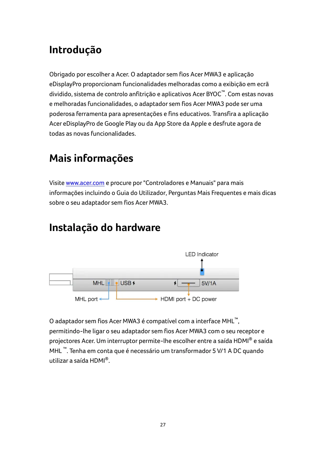 Baixe as instruções para o seu em formato PDF gratuitamente! Encontre o seu manual WIRELESSCAST - ACER e retome o controlo do seu dispositivo eletrónico. Nesta página estão publicados todos os documentos necessários para a utilização do seu dispositivo. WIRELESSCAST da marca ACER.