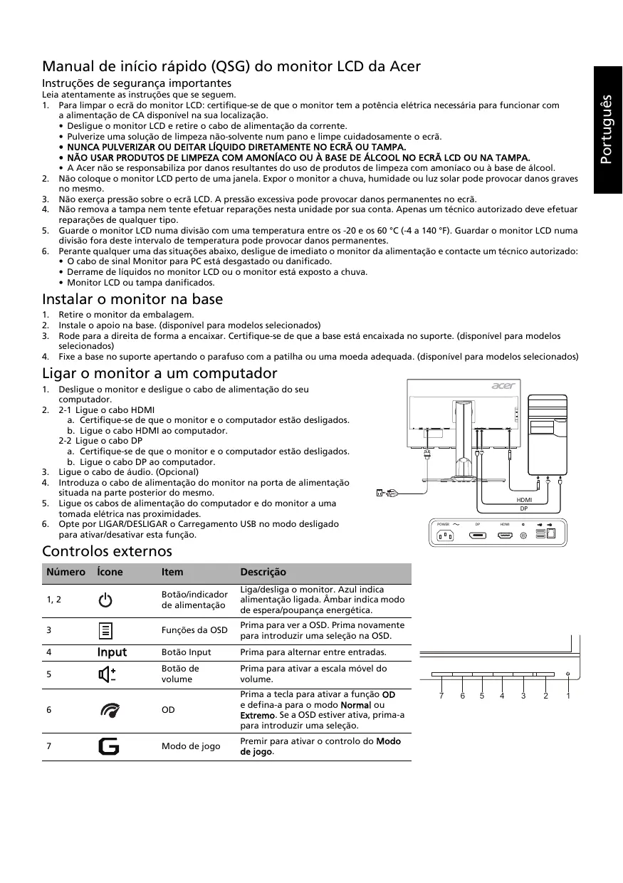 Baixe as instruções para o seu Monitor de jogo em formato PDF gratuitamente! Encontre o seu manual XB271HU - ACER e retome o controlo do seu dispositivo eletrónico. Nesta página estão publicados todos os documentos necessários para a utilização do seu dispositivo. XB271HU da marca ACER.