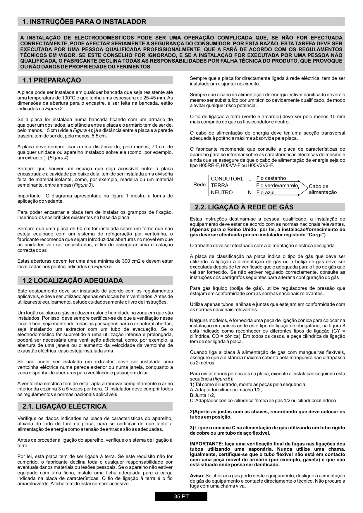 A placa pode ser instalada em qualquer bancada que seja resistente até uma temperatura de 100°C e que tenha uma espessura de 25-45 mm. As dimensões da abertura para o encastre, a ser feita na bancada, estão indicadas na Figura 2. Sempre que o cabo de alimentação de energia estiver danificado deverá o mesmo ser substituído por um técnico devidamente qualificado, de modo a evitar qualquer risco potencial. O fio de ligação à terra (verde e amarelo) deve ser pelo menos 10 mm mais comprido do que os fios condutor e neutro. Se a placa for instalada numa bancada ficando com um armário de qualquer um dos lados, a distância entre a placa e o armário tem de ser de, pelo menos, 15 cm (vide a Figura 4); já a distância entre a placa e a parede traseira tem de ser de, pelo menos, 5,5 cm. O cabo de alimentação de energia deve ter uma secção transversal adequada à potência máxima absorvida pela placa. A placa deve sempre ficar a uma distância de, pelo menos, 70 cm de qualquer unidade ou aparelho instalado sobre ela (como, por exemplo, um extractor). (Figura 4) O fabricante recomenda que consulte a placa de características do aparelho para se informar sobre as características eléctricas do mesmo e ainda que se assegure de que o cabo de alimentação de energia seja do tipo H05RR-F, H05VV-F ou H05V2V2-F. Sempre que houver um espaço que seja acessível entre a placa encastrada e a cavidade por baixo dela, tem de ser instalada uma divisória feita de material isolante, como, por exemplo, madeira ou um material semelhante, entre ambas (Figura 3). CONDUTORL L Fio castanho Rede TERRA Fio verde/amarelo NEUTRO N Fio azul Importante O diagrama apresentado na figura 1 mostra a forma de aplicação do vedante. Cabo de alimentação