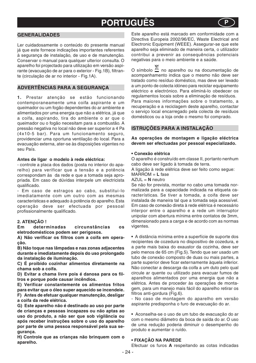 PORTUGUÊS GENERALIDADES Ler cuidadosamente o conteúdo do presente manual já que este fornece indicações importantes referentes à segurança de instalação, de uso e de manutenção. Conservar o manual para qualquer ulterior consulta. O aparelho foi projectado para utilização em versão aspirante (evacuação de ar para o exterior - Fig.1B), filtrante (circulação de ar no interior - Fig.1A).