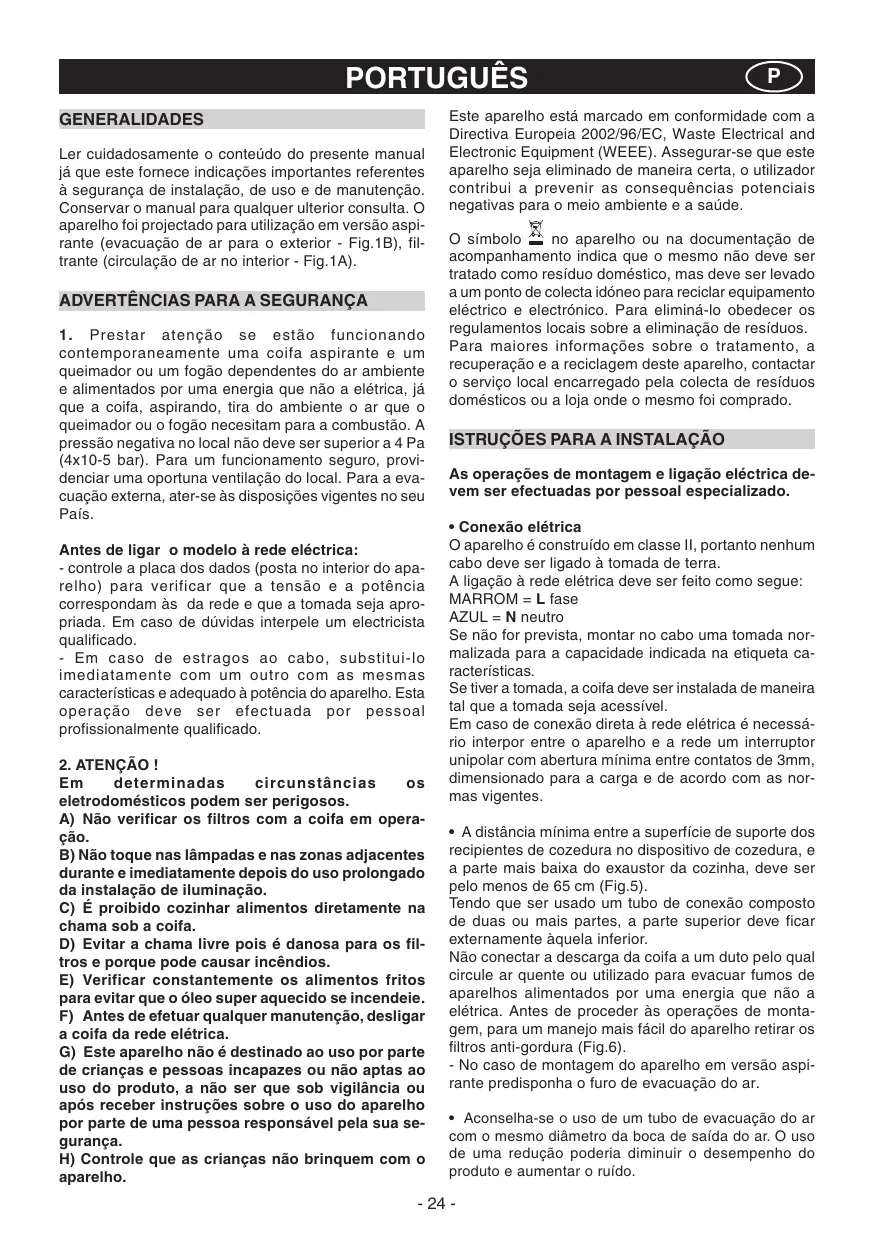PORTUGUÊS GENERALIDADES Ler cuidadosamente o conteúdo do presente manual já que este fornece indicações importantes referentes à segurança de instalação, de uso e de manutenção. Conservar o manual para qualquer ulterior consulta. O aparelho foi projectado para utilização em versão aspirante (evacuação de ar para o exterior - Fig.1B), filtrante (circulação de ar no interior - Fig.1A).