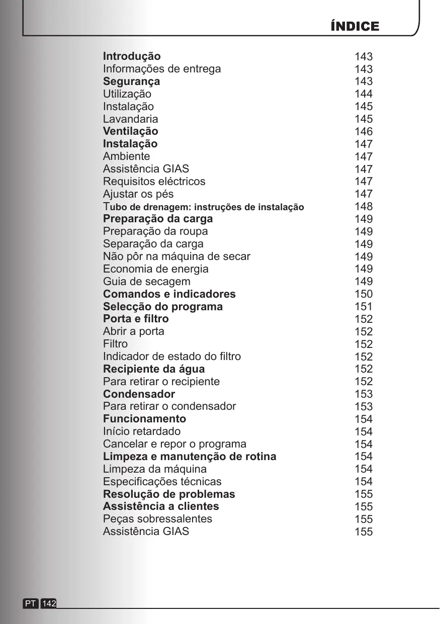 Qual Poderá Ser A Causa De... Anomalias que você mesmo pode remediar Antes de contactar a Assistência GIAS para aconselhamento técnico, passe rapidamente pela seguinte lista de verificação. Se chamar um técnico e este verificar que a máquina está a funcionar normalmente, foi mal instalada ou usada incorrectamente, ser-lhe-á cobrada uma quantia consoante o caso. Se o problema persistir após ter completado as verificações recomendadas, ligue para a Assistência GIAS, eles poderão eventualmente resolver o problema pelo telefone. O tempo remanescente indicado no visor poderá ser alterado durante o ciclo de secagem. O tempo remanescente é continuamente verificado durante o ciclo de secagem e, o tempo é ajustado para fornecer a estimativa mais correcta. O tempo remanescente pode ser aumentado ou diminuído durante o ciclo de secagem e isso é normal. O tempo de secagem é demasiado longo/as roupas não estão suficientemente secas… ● Seleccionou o tempo/programa de secagem correctos? ●A roupa estava demasiado ensopada? As roupas foram bem torcidas ou centrifugadas? ● O filtro necessita de limpeza? ● O condensador necessita de limpeza? ● A máquina está com excesso de roupa? ● As entradas, saídas e a base da máquina estão desobstruídas? ●A opção foi seleccionada num ciclo anterior? A máquina não funciona… ● Existe energia eléctrica para alimentar a máquina? Verifique utilizando outro aparelho eléctrico, por exemplo, um candeeiro. ● A ficha está correctamente ligada à corrente eléctrica? ● Houve algum corte de corrente? ● O fusível fundiu-se? ● A porta está bem fechada? ●A máquina está ligada à corrente, quer através da tecla ‘ON’, quer através do cabo de alimentação? ● O tempo de secagem ou o programa foram seleccionados? ● A máquina foi ligada de novo após ter aberto a porta? ● A máquina deixou de funcionar devido ao tabuleiro da água estar cheio e precisar de ser esvaziado? A máquina de secar faz muito ruído… ● Desligue a máquina de secar e contacte a Assistência GIAS para obter ajuda. O indicador está aceso… ● O filtro necessita de limpeza? ● O condensador necessita de limpeza? O indicador está aceso… ● O recipiente da água necessita de ser esvaziado?