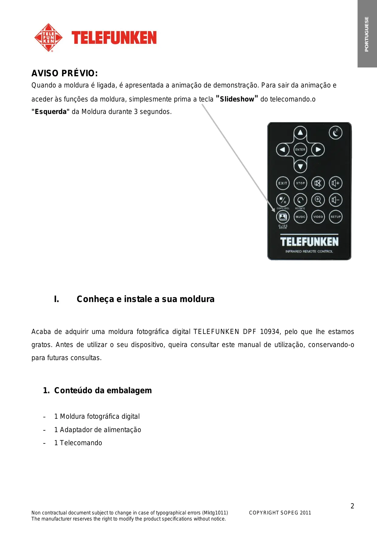 Non contractual document subject to change in case of typographical errors (Mktg1011) The manufacturer reserves the right to modify the product specifications without notice. COPYRIGHT SOPEG 2011 PORTUGUESE AVISO PRÉVIO: Quando a moldura é ligada, é apresentada a animação de demonstração. Para sair da animação e aceder às funções da moldura, simplesmente prima a tecla "Slideshow" do telecomando.o "Esquerda" da Moldura durante 3 segundos.