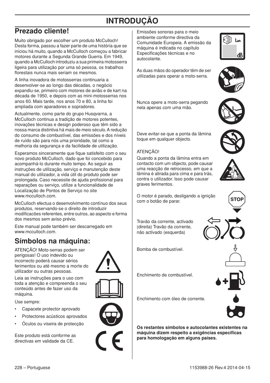 Declaración CE de conformidad (Rige sólo para Europa) Nosotros, Husqvarna AB, SE-561 82 Huskvarna, Suecia, tel. +46-36-146500, declaramos que las motosierras para los servicios forestales McCulloch CS 340 y CS 380, a partir del número de serie del año 2011 en adelante (el año se indica claramente en la placa de identificación, seguido del número de serie), cumplen con las siguientes disposiciones en la DIRECTIVA DEL CONSEJO: - 2006/42/CE «relativa a máquinas» del 17 de mayo de 2006. - 2004/108/CEE, ”referente a compatibilidad electromagnética”, del 15 de diciembre de 2004. - 2000/14/CE, ”sobre emisiones sonoras en el entorno” del 8 de mayo de 2000. Se ha utilizado el proceso de evaluación de conformidad efectuado según el Anexo V de la anteriormente citada directiva. Para más información sobre las emisiones sonoras, consulte el capítulo Datos técnicos. Se han aplicado las siguientes normas: EN ISO 12100-2/A1:2009, CISPR 12:2007, EN ISO 11681-1:2008 Organismo inscripto: 0404, SMP, Svensk Maskinprovning AB, Fyrisborgsgatan 3, SE-754 50 Uppsala, Suecia, ha efectuado el examen CE de tipo conforme a la Directiva sobre máquinas (2006/42/CE), artículo 12, apartado 3b. Los certificados sobre el examen CE de tipo conforme al Anexo IX tienen el número: 0404/11/2298. La motosierra entregada coincide con el ejemplar que fue sometido al examen CE de tipo. Huskvarna, 1 de marzo de 2011 Ronnie E. Goldman, Director técnico. (Presentante autorizado de Husqvarna AB y responsable de la documentación técnica.) 1153988-26 Rev.4 2014-04-15 Spanish – 227 INTRODUÇÃO Prezado cliente! Muito obrigado por escolher um produto McCulloch! Desta forma, passou a fazer parte de uma história que se iniciou há muito, quando a McCulloch começou a fabricar motores durante a Segunda Grande Guerra. Em 1949, quando a McCulloch introduziu a sua primeira motosserra ligeira para utilização por uma só pessoa, os trabalhos florestais nunca mais seriam os mesmos. A linha inovadora de motosserras continuaria a desenvolver-se ao longo das décadas, o negócio expandiu-se, primeiro com motores de avião e de kart na década de 1950, e depois com as mini-motosserras nos anos 60. Mais tarde, nos anos 70 e 80, a linha foi ampliada com aparadores e sopradores. Actualmente, como parte do grupo Husqvarna, a McCulloch continua a tradição de motores potentes, inovações técnicas e design poderoso que têm sido a nossa marca distintiva há mais de meio século. A redução do consumo de combustível, das emissões e dos níveis de ruído são para nós uma prioridade, tal como a melhoria da segurança e da facilidade de utilização. Esperamos sinceramente que fique satisfeito com o seu novo produto McCulloch, dado que foi concebido para acompanhá-lo durante muito tempo. Ao seguir as instruções de utilização, serviço e manutenção deste manual do utilizador, a vida útil do produto pode ser prolongada. Caso necessite de ajuda profissional para reparações ou serviço, utilize a funcionalidade de Localização de Pontos de Serviço no site www.mcculloch.com. McCulloch efectua o desenvolvimento contínuo dos seus produtos, reservando-se o direito de introduzir modificacões referentes, entre outros, ao aspecto e forma dos mesmos sem aviso prévio. Este manual pode também ser descarregado em www.mcculloch.com. Emissões sonoras para o meio ambiente conforme directiva da Comunidade Europeia. A emissão da máquina é indicada no capítulo Especificações técnicas e no autocolante. As duas mãos do operador têm de ser utilizadas para operar a moto-serra. Nunca opere a moto-serra pegando nela apenas com uma mão. Deve evitar-se que a ponta da lâmina toque em qualquer objecto. ATENÇÃO! Quando a ponta da lâmina entra em contacto com um objecto, pode causar uma reacção de retrocesso, em que a lâmina é atirada para cima e para trás, contra o utilizador. Isso pode causar graves ferimentos. O motor é parado, desligando a ignição com o botão de parar. Travão da corrente, activado (direita) Travão da corrente, não activado (esquerda) Símbolos na máquina: ATENÇÃO! Moto-serras podem ser perigosas! O uso indevido ou incorrecto poderá causar sérios ferimentos ou até mesmo a morte do utilizador ou outras pessoas. Leia as instruções para o uso com toda a atenção e compreenda o seu conteúdo antes de fazer uso da máquina. Use sempre: