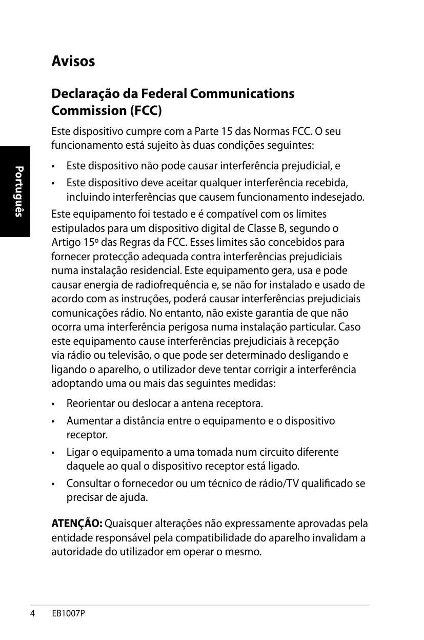 Avisos Declaração da Federal Communications Commission (FCC) Este dispositivo cumpre com a Parte 15 das Normas FCC. O seu funcionamento está sujeito às duas condições seguintes: Este dispositivo não pode causar interferência prejudicial, e Este dispositivo deve aceitar qualquer interferência recebida, incluindo interferências que causem funcionamento indesejado. Este equipamento foi testado e é compatível com os limites estipulados para um dispositivo digital de Classe B, segundo o Artigo 15º das Regras da FCC. Esses limites são concebidos para fornecer protecção adequada contra interferências prejudiciais numa instalação residencial. Este equipamento gera, usa e pode causar energia de radiofrequência e, se não for instalado e usado de acordo com as instruções, poderá causar interferências prejudiciais comunicações rádio. No entanto, não existe garantia de que não ocorra uma interferência perigosa numa instalação particular. Caso este equipamento cause interferências prejudiciais à recepção via rádio ou televisão, o que pode ser determinado desligando e ligando o aparelho, o utilizador deve tentar corrigir a interferência adoptando uma ou mais das seguintes medidas: Português