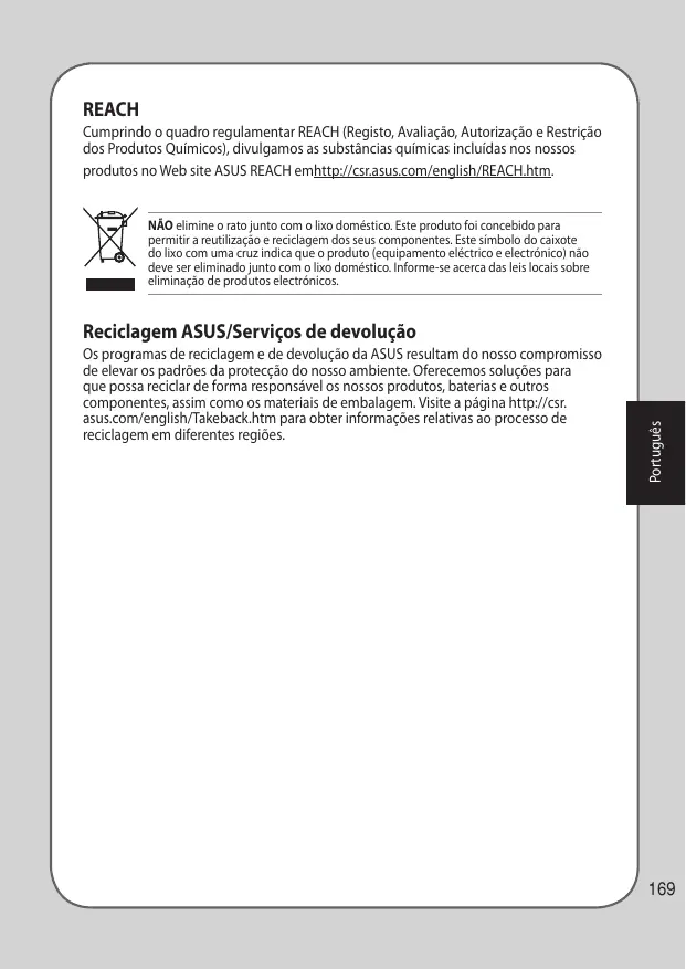 REACH Cumprindo o quadro regulamentar REACH (Registo, Avaliação, Autorização e Restrição dos Produtos Químicos), divulgamos as substâncias químicas incluídas nos nossos produtos no Web site ASUS REACH emhttp://csr.asus.com/english/REACH.htm. NÃO elimine o rato junto com o lixo doméstico. Este produto foi concebido para permitir a reutilização e reciclagem dos seus componentes. Este símbolo do caixote do lixo com uma cruz indica que o produto (equipamento eléctrico e electrónico) não deve ser eliminado junto com o lixo doméstico. Informe-se acerca das leis locais sobre eliminação de produtos electrónicos.