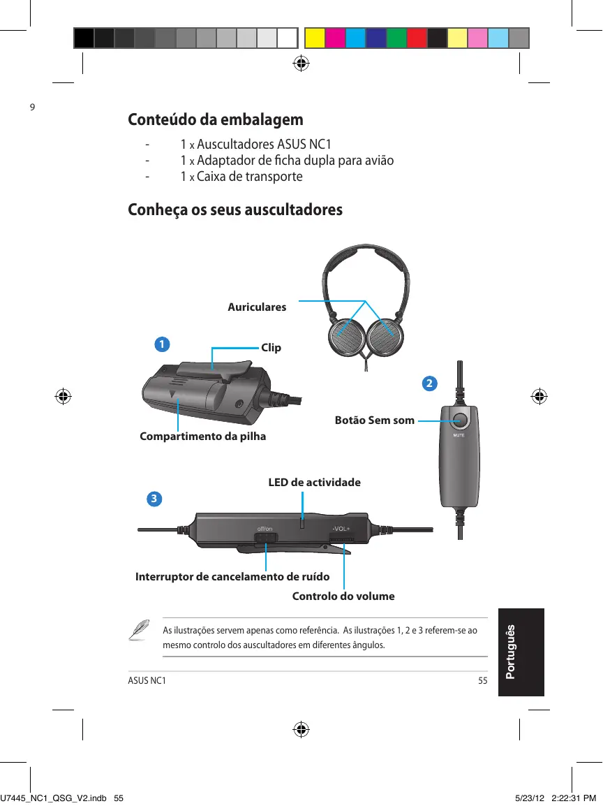 Interruptor de cancelamento de ruído Controlo do volume As ilustrações servem apenas como referência. As ilustrações 1, 2 e 3 referem-se ao mesmo controlo dos auscultadores em diferentes ângulos. ASUS NC1