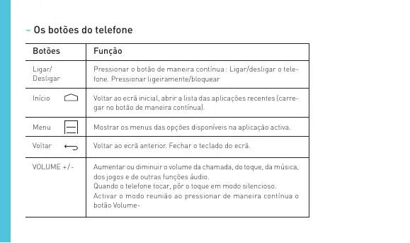 Wi-Fi ligado Potência do sinal Bluetooth activado Rede GPRS ligada GPS em serviço Rede EDGE ligada Chamada verbal em curso Rede 3G ligada Chamada em espera HSPA (3G+) ligado Chamada não atendida HSPA+ (3G++) ligado Sincronização Rede 4G ligada Novo e-mail Sem sinal Alarme activado Em itinerância Modo Silencioso activado Wi-Fi disponível Novo correio de voz Descarregamento Ligado ao computador Nível de carga da bateria Novo SMS ou MMS Modo avião activado Segundo as aplicações, as notificações podem estar acompanhadas de um sinal sonoro, uma vibração ou luzes intermitentes. O painel de notificações Para visualizar os detalhes de todas as suas notificações. As informações relativas ao recebimento de novas mensagens, de futuros eventos da agenda, o estado dos descarregamentos… serão então mostrados. O nome do operador aparece na parte inferior do painel. Pressione em para apagar todas as notificações pontuais. As aplicações em curso serão conservadas na lista. Faça deslizar uma notificação para a esquerda ou para a direita para a apagar. Para fechar o painel, faça-o deslizar para a parte superior do ecrã ou . Para aceder ao painel das pressione em VOLTAR configurações, pressione em Para fazer isto mais rapidamente, puxe a barra de notificações com dois dedos para baixo. ~ Utilização dos menus Menu de opções Os menus do seu telefone estão apresentados sob a forma de Menu instantâneo ou Menu de opções. Para mostrar um menu de opções, pressione o bo. O menu de opções propõe acções ou tão MENU configurações relacionadas com a aplicação ou com o ecrã actual, mas não a um elemento preciso como o menu instantâneo. Menu instantâneo Para fazer aparecer um menu instantâneo, pressione de maneira prolongada um elemento do ecrã. O menu instantâneo propõe acções associadas a este elemento. Por exemplo, pressione de maneira prolongada um SMS e as opções relacionadas com essa mensagem aparecem. Atenção : todos os elementos não contêm um menu instantâneo. Ao pressionar de maneira prolongada um elemento relacionado com qualquer menu, não acontece nada. Atenção : alguns ecrãs não dispõem de ecrãs de opções. Instruções de segurança Para utilizar este telefone com toda a segurança, leia atentamente as instruções de segurança :