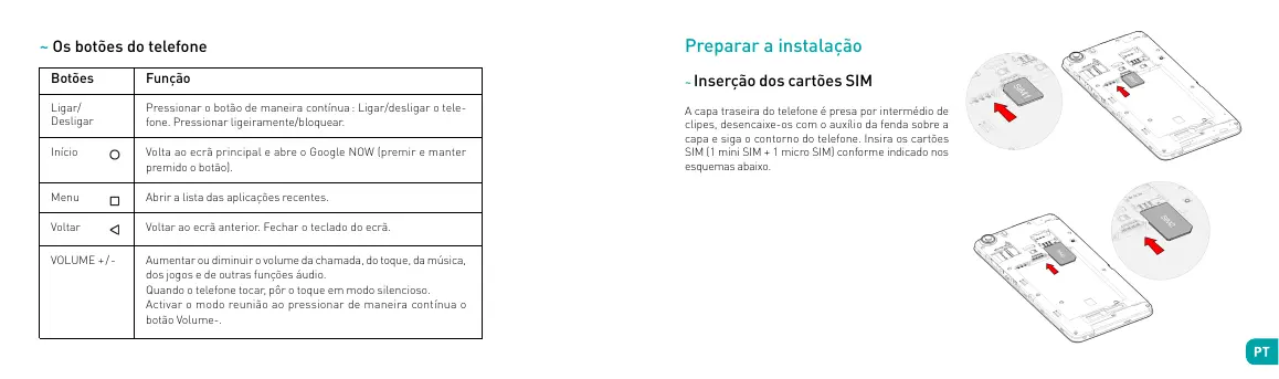 Descubra o seu telefone Entrada auscultadores de 3,5 mm Porta micro USB Objectiva de foto Luz de flash LED Auscultador Máquina fotográfica frontal Volume +/On-Off/Bloqueio Pantalla táctil Inicio Voltar Menú Altifalante ~ Os botões do telefone Preparar a instalação Botões Função ~ Inserção dos cartões SIM Ligar/ Desligar Pressionar o botão de maneira contínua : Ligar/desligar o telefone. Pressionar ligeiramente/bloquear. Início Volta ao ecrã principal e abre o Google NOW (premir e manter premido o botão). A capa traseira do telefone é presa por intermédio de clipes, desencaixe-os com o auxílio da fenda sobre a capa e siga o contorno do telefone. Insira os cartões SIM (1 mini SIM + 1 micro SIM) conforme indicado nos esquemas abaixo. Menu Abrir a lista das aplicações recentes. Voltar Voltar ao ecrã anterior. Fechar o teclado do ecrã. VOLUME + / - Aumentar ou diminuir o volume da chamada, do toque, da música, dos jogos e de outras funções áudio. Quando o telefone tocar, pôr o toque em modo silencioso. Activar o modo reunião ao pressionar de maneira contínua o botão Volume-. ~ Instalação do cartão de memória ~ Carregamento da bateria ~ Ligar e desligar O seu telemovel esta preparado para um cartao de memoria MicroSD ate 64 Gb. Insira o cartao de memoria no lugar previsto. O seu telefone é alimentado por uma bateria recarregável. A luz vermelha intermitente indica que a bateria está muito fraca. Um nível de carga demasiado fraco pode reduzir o seu tempo de vida. Ligue o carregador a uma tomada e o adaptador micro USB, na entrada USB do telefone. O sinal do estado do telefone torna-se vermelho, indicando que está a ser carregado. Quando o carregamento estiver terminado, o sinal do estado do telemóvel torna-se verde. Desligue-o do carregador. Para mais informações, consulte a seção “Indicações de segurança”. Para acender o telefone, carregue no botão ON/OFF de forma prolongada até que o telefone vibre. Se o seu cartão SIM estiver bloqueado, deve digitar o código PIN correcto para desbloquear o cartão SIM durante a colocação em tensão do telefone. Depois de três tentativas erradas de introdução do código PIN, o telemóvel bloqueia e é necessário desbloqueá-lo com o seu código PUK (fornecido com o cartão SIM, se não for o caso, contacte o seu operador telefónico). Para desligar o telefone, pressione de maneira prolongada o botão LIGAR-DESLIGAR até à abertura do menu, pressione em Desligar Carregue de seguida em OK para confirmar. O telefone vibra quando está completamente desligado. Operações de base ~ Gestão SIM Quando ligar o seu telefone pela primeira vez ou mudar de cartao SIM, de cartao SIM, aparecerao informacoes diversas relativas ao(s) cartao(oes) SIM. Devera modificar ou nao os parametros relativos as chamadas, as mensagens e a ligacao a internet.O cartao SIM1 esta configurado como cartao SIM por defeito para a conexao dos dados. Podera :