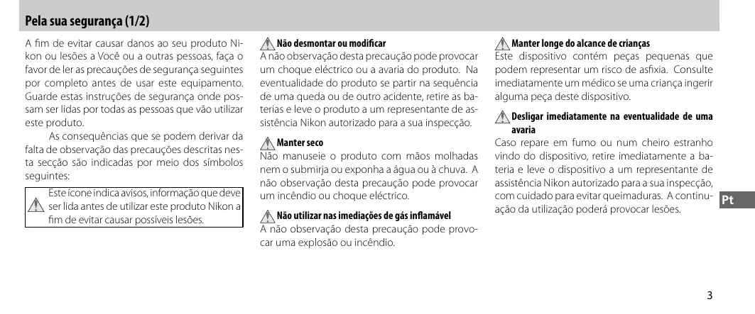 Le non-respect de cette précaution peut avoir pour conséquence une décharge électrique ou un dysfonctionnement du produit. Si le produit se brise suite à une chute ou tout autre accident, retirez les piles et portez-le à un centre service Nikon agréé pour le faire inspecter. Conserver le produit à l’abri de l’humidité Ne manipulez pas le produit avec les mains mouillées, ne l’immergez pas et ne l’exposez pas à l’eau ou à la pluie. Le non-respect de cette précaution peut causer un incendie ou une décharge électrique. Ne pas utiliser le produit en présence de gaz inflammables Le non-respect de cette précaution peut causer une explosion ou un incendie.