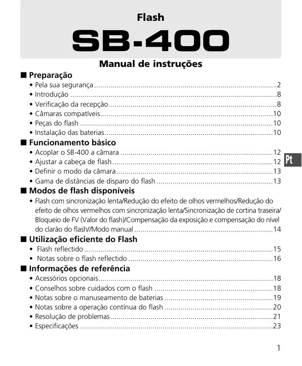 Encontre gratuitamente o manual do aparelho SPEEDLIGHT SB-400 NIKON em formato PDF.