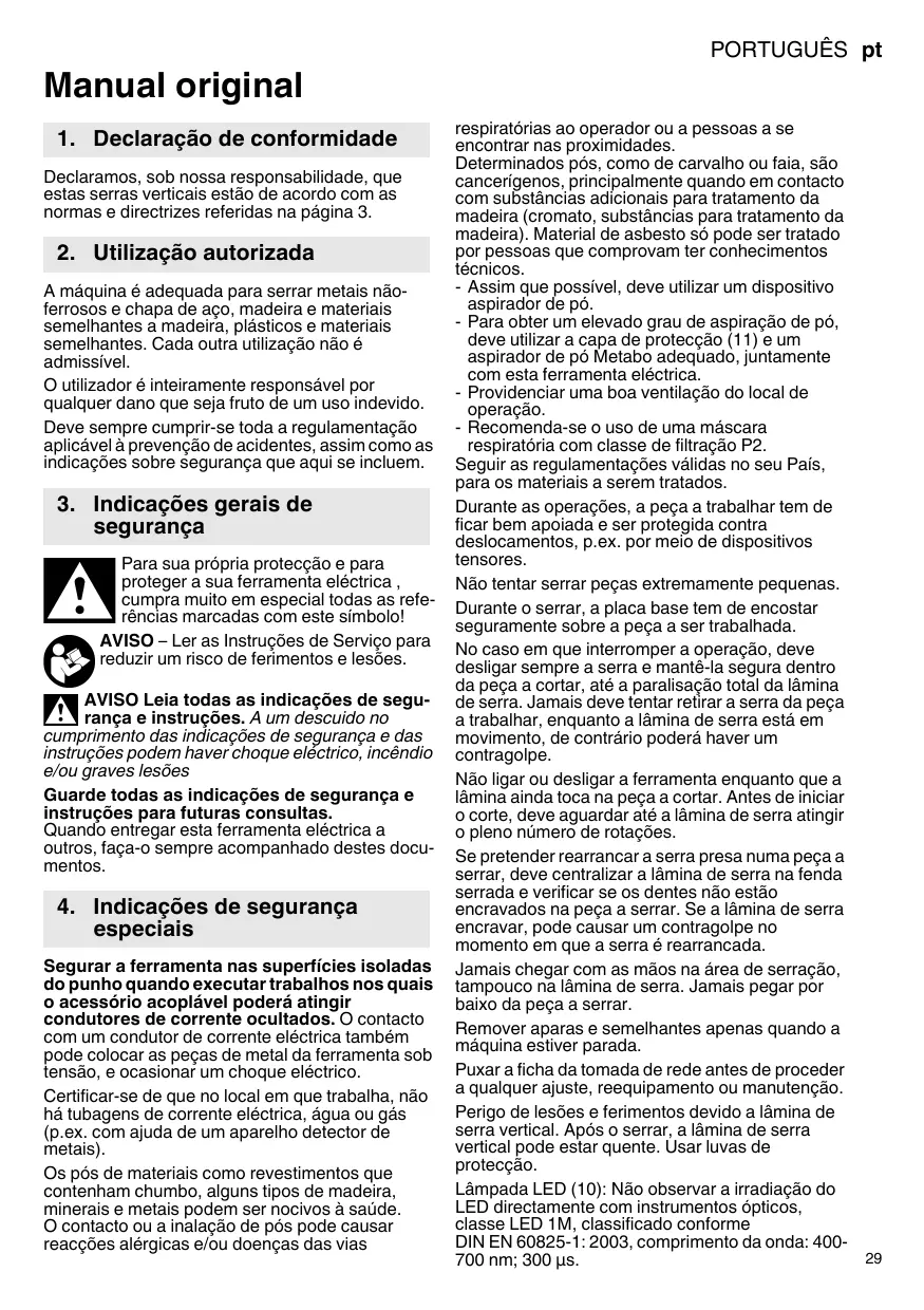 Perigo de lesões e ferimentos devo a lámina de serra vertical. Após o serrar, a lámina de serra vertical pode estar quente. Usar luvas de proteção.
