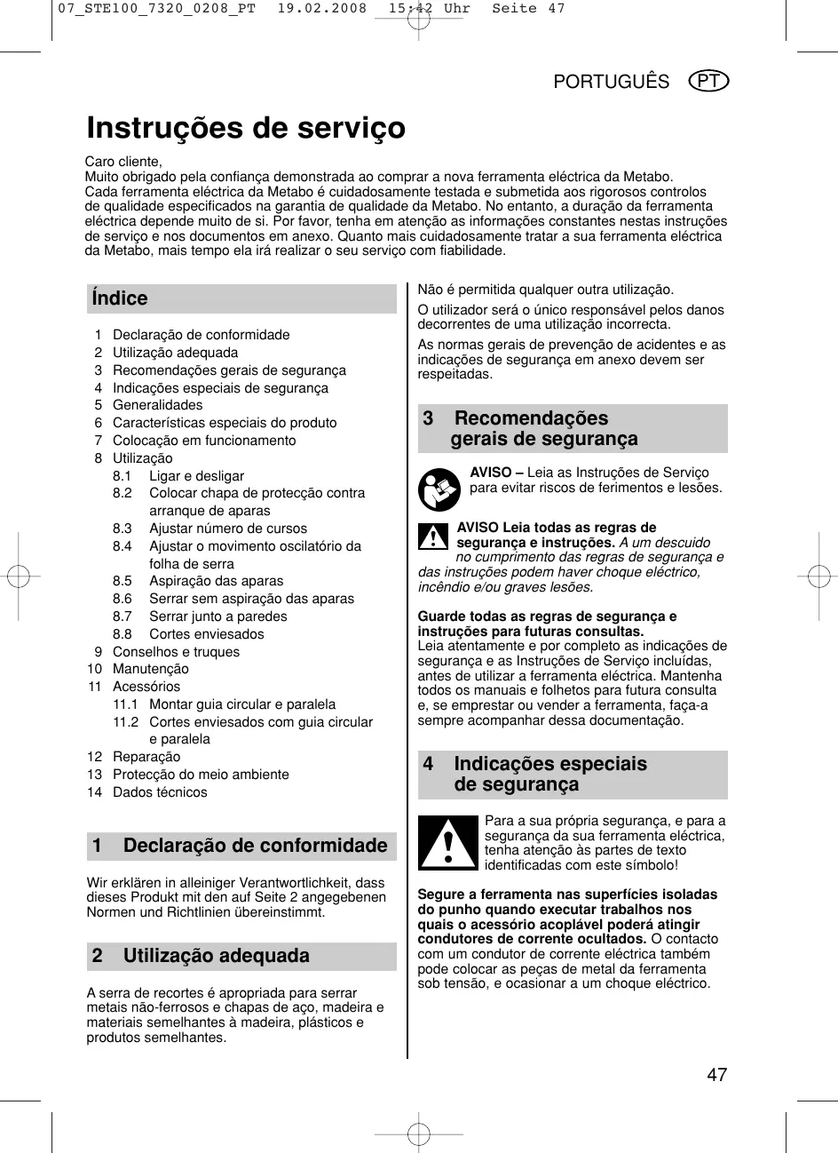 15:42 Uhr Seite 47 PORTUGUÊS Instruções de serviço Caro cliente, Muito obrigado pela confiança demonstrada ao comprar a nova ferramenta eléctrica da Metabo. Cada ferramenta eléctrica da Metabo é cuidadosamente testada e submetida aos rigorosos controlos de qualidade especificados na garantia de qualidade da Metabo. No entanto, a duração da ferramenta eléctrica depende muito de si. Por favor, tenha em atenção as informações constantes nestas instruções de serviço e nos documentos em anexo. Quanto mais cuidadosamente tratar a sua ferramenta eléctrica da Metabo, mais tempo ela irá realizar o seu serviço com fiabilidade. Índice