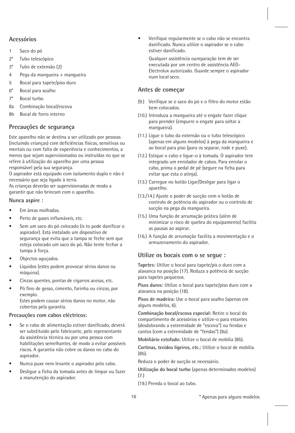 - Ve rifiq ue re gul arm e nte se o cabo não se e ncontra danificado. Nunca util ize o aspirador se o cabo e stive r danificado. Qual q ue r assistência oure paração te m de se r e xe cutada por um ce ntro de assistência AEGEl e ctrol ux autorizado. Guarde se m pre o aspirador num l ocalse co. Ante s de com e çar (9 .) Ve rifiq ue se o saco do pó e o fil tro do m otor e stão be m col ocados. (10.) Introduza a m angue ira até o e ngate faze r cl iq ue para pre nde r (e m purre o e ngate para sol tar a m angue ira). Pre cauçõe s de se gurança (11.) Ligue o tubo da e xte nsão ou o tubo te l e scópico (ape nas e m al guns m ode l os) à pe ga da m angue ira e ao bocalpara piso (para os se parar, rode e puxe ). Este apare l h o não se de stina a se r util izado por pe ssoas (incl uindo crianças) com de ficiências físicas, se nsitivas ou m e ntais ou com fal ta de e xpe riência e conh e cim e ntos, a m e nos q ue se jam supe rvisionadas ou instruídas no q ue se re fe re à util ização do apare l h o por um a pe ssoa re sponsáve lpe l a sua se gurança. O aspirador e stá e q uipado com isol am e nto dupl o e não é ne ce ssário q ue se ja l igado à te rra. As crianças de ve rão se r supe rvisionadas de m odo a garantir q ue não brincam com o apare l h o. (12.) Estiq ue o cabo e l igue - o à tom ada. O aspirador te m inte grado um e nrol ador de cabos. Para e nrol ar o cabo, prim a o pe dalde pé (se gure na fich a para e vitar q ue e sta o atinja). (13.) Carre gue no botão Ligar/D e sl igar para l igar o apare l h o. (13./14.) Ajuste o pode r de sucção com o botão de control o de potência do aspirador ou o control o de sucção na pe ga da m angue ira. Nunca aspire :