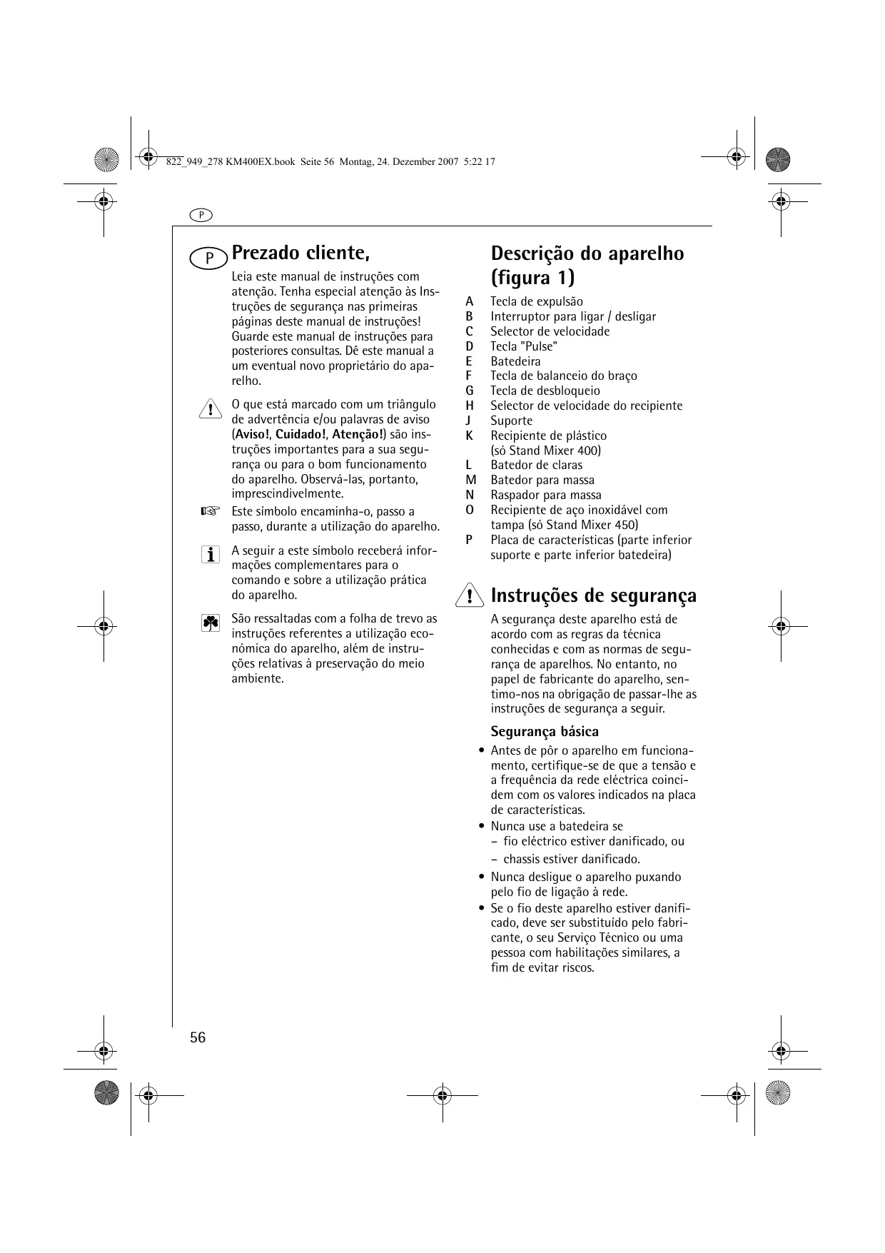 São ressaltadas com a folha de trevo as instruções referentes a utilização económica do aparelho, além de instruções relativas à preservação do meio ambiente. Descrição do aparelho (figura 1)