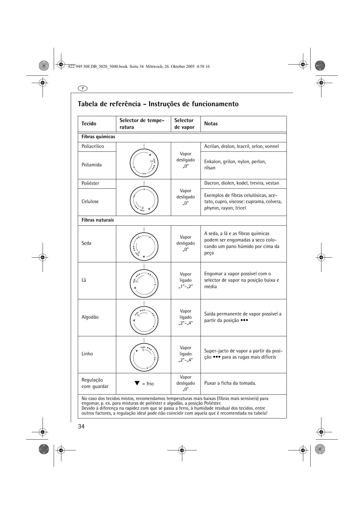 Vapor ligado „1“–„2“ Engomar a vapor possível com o selector de vapor na posição baixa e média Algodão Vapor ligado „2“–„4“ Saída permanente de vapor possível a partir da posição ••• Linho Vapor ligado „2“–„4“ Super-jacto de vapor a partir da posição ••• para as rugas mais difíceis Seda Regulação com-guardar = frio Vapor desligado „0“ Puxar a ficha da tomada. No caso dos tecidos mistos, recomendamos temperaturas mais baixas (fibras mais sensíveis) para engomar, p. ex. para misturas de poliéster e algodão, a posição Poliéster. Devido à diferença na rapidez com que se passa a ferro, à humidade residual dos tecidos, entre outros factores, a regulação ideal pode não coincidir com aquela que é recomendada na tabela!
