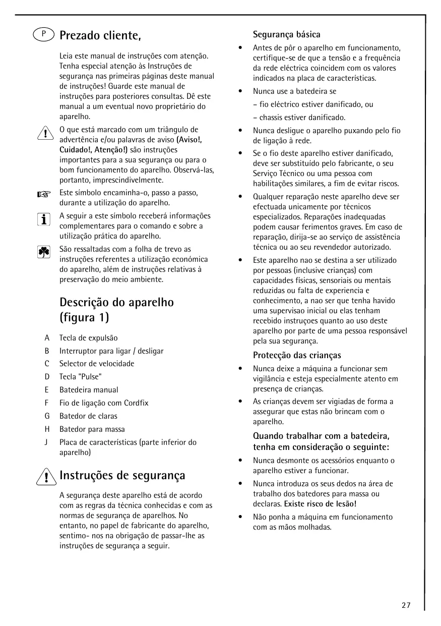 - Nunca use a bate de ira se – fio e l éctrico e stive r danificado, ou – ch assis e stive r danificado. O q ue e stá m arcado com um triângul o de adve rtência e /ou pal avras de aviso (Aviso!, Cuidado!, Ate nção!) são instruçõe s im portante s para a sua se gurança ou para o bom funcionam e nto do apare l h o. O bse rvá- l as, portanto, im pre scindive l m e nte .