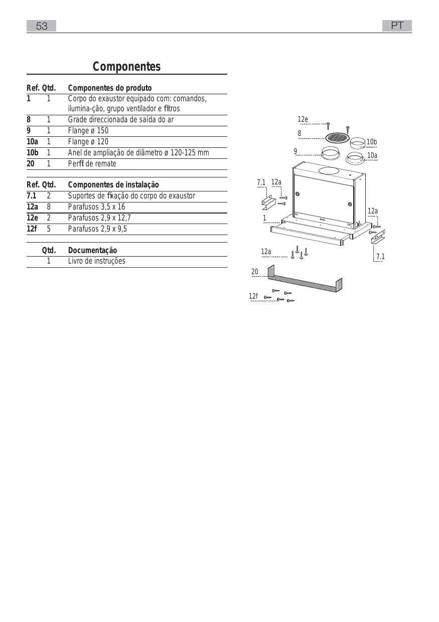 Componentes do produto Corpo do exaustor equipado com: comandos, ilumina-ção, grupo ventilador e filtros Grade direccionada de saída do ar Flange ø 150 Flange ø 120 Anel de ampliação de diâmetro ø 120-125 mm Perfil de remate Componentes de instalação Suportes de fixação do corpo do exaustor Parafusos 3,5 x 16 Parafusos 2,9 x 12,7 Parafusos 2,9 x 9,5 12e