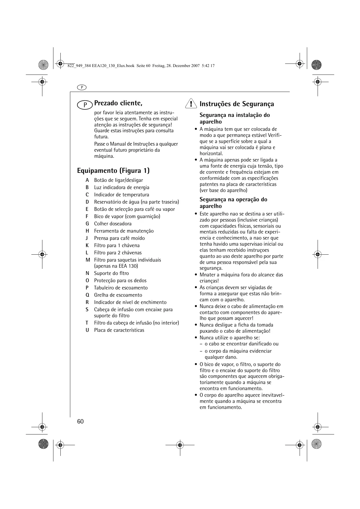 Botão de ligar/desligar Luz indicadora de energia Indicador de temperatura Reservatório de água (na parte traseira) Botão de selecção para café ou vapor Bico de vapor (com guarnição) Colher doseadora Ferramenta de manutenção Prensa para café moído Filtro para 1 chávena Filtro para 2 chávenas Filtro para saquetas individuais (apenas na EEA 130) Suporte do fltro Protecção para os dedos Tabuleiro de escoamento Grelha de escoamento Indicador de nível de enchimento Cabeça de infusão com encaixe para suporte do filtro Filtro da cabeça de infusão (no interior) Placa de características 1 Instruções de Segurança Segurança na instalação do aparelho