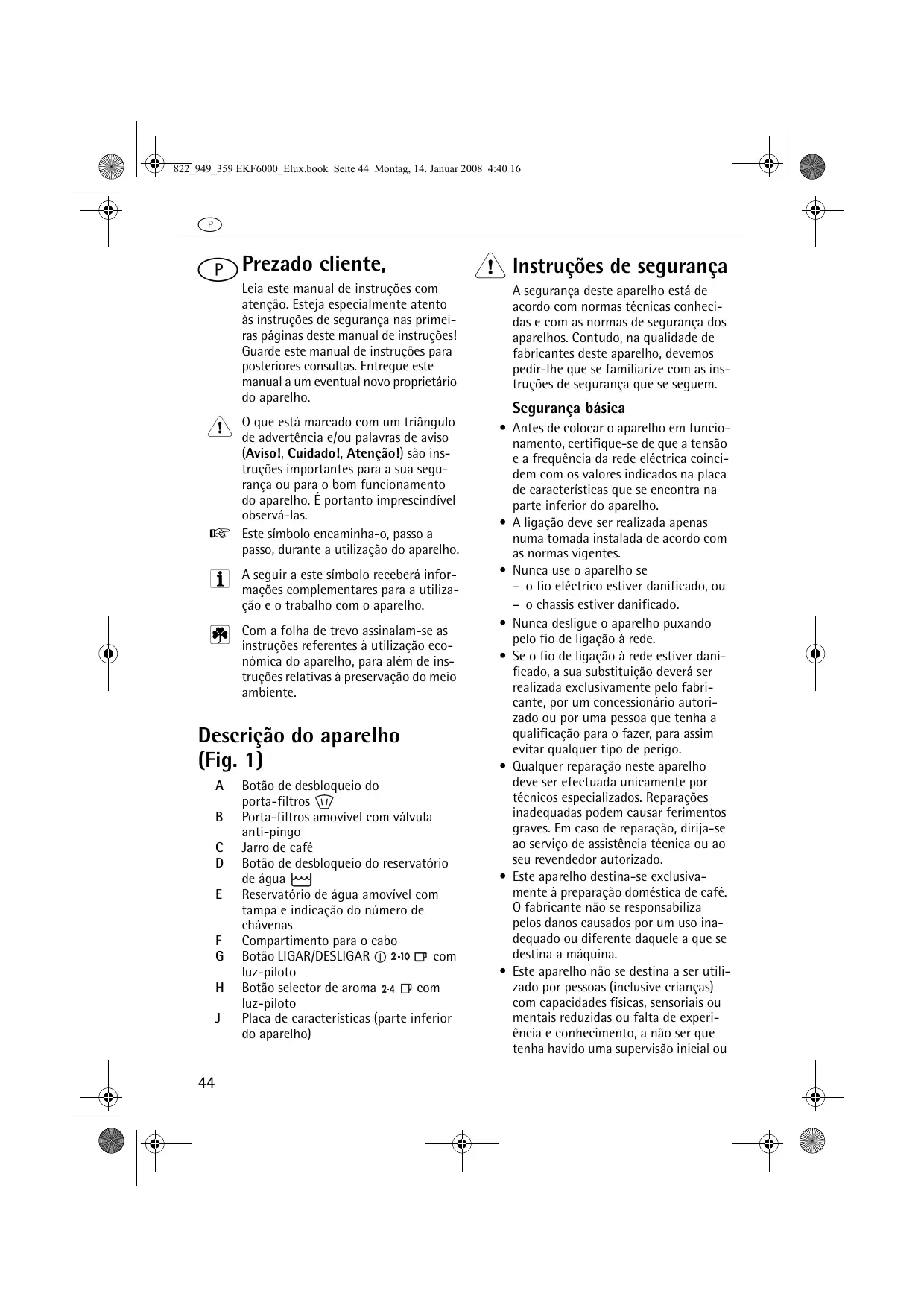 Botão de desbloqueio do porta-filtros Porta-filtros amovível com válvula anti-pingo Jarro de café Botão de desbloqueio do reservatório de água Reservatório de água amovível com tampa e indicação do número de chávenas Compartimento para o cabo Botão LIGAR/DESLIGAR com luz-piloto Botão selector de aroma com luz-piloto Placa de características (parte inferior do aparelho) Segurança básica 822_949_359 EKF6000_Elux.book Seite 45 Montag, 14. Januar 2008 4:40 16