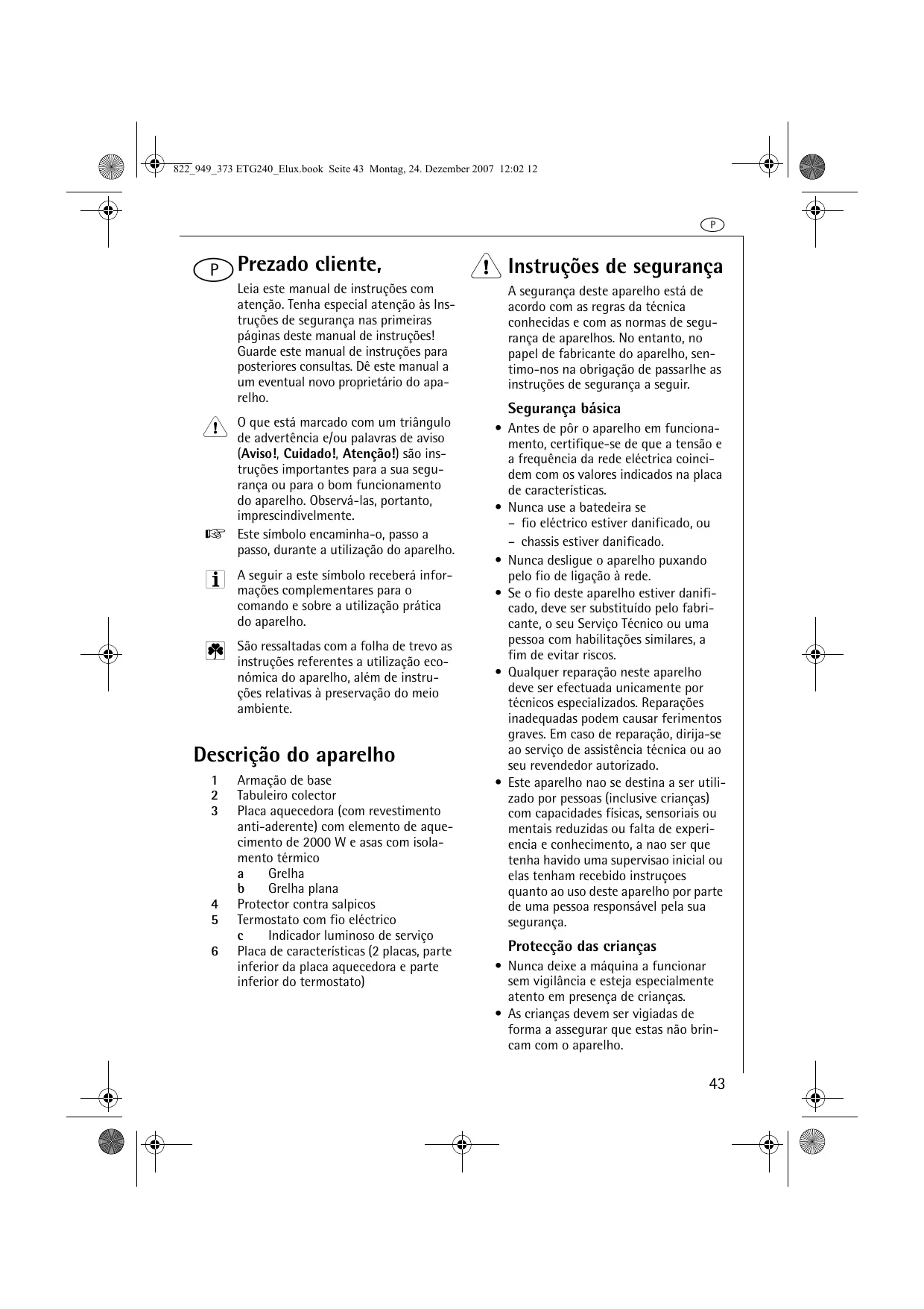 Encontre gratuitamente o manual do aparelho ETG240 AEG-ELECTROLUX em formato PDF.