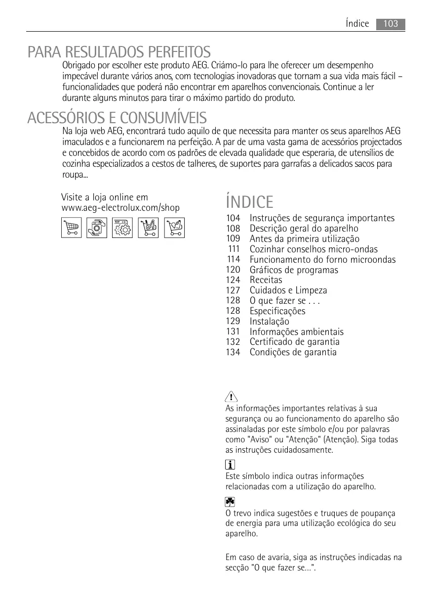Instruções de segurança importantes Descrição geral do aparelho Antes da primeira utilização Cozinhar conselhos micro-ondas Funcionamento do forno microondas Gráficos de programas Receitas Cuidados e Limpeza O que fazer se . . . Especificações Instalação Informações ambientais Certificado de garantia Condições de garantia As informações importantes relativas à sua segurança ou ao funcionamento do aparelho são assinaladas por este símbolo e/ou por palavras como "Aviso" ou "Atenção" (Atenção). Siga todas as instruções cuidadosamente. Este símbolo indica outras informações relacionadas com a utilização do aparelho. O trevo indica sugestões e truques de poupança de energia para uma utilização ecológica do seu aparelho. Em caso de avaria, siga as instruções indicadas na secção "O que fazer se…".