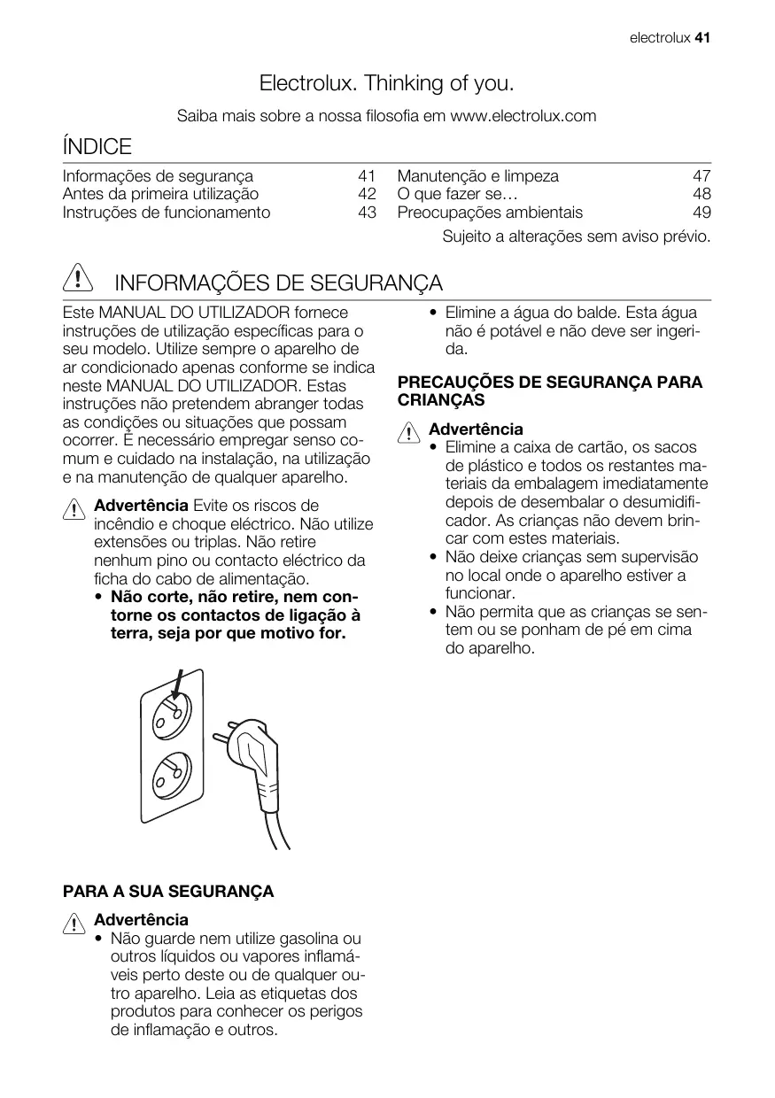electrolux 41 Electrolux. Thinking of you. Saiba mais sobre a nossa filosofa em www.electrolux.com INDICE Informaçôes de segurança 41 Manutençäo e limpeza 47 Antes da primeira utilizaçäo 42 O que fazer se... 48 Instruçôes de funcionamento 43 Preocupaçües ambientais 49 Sujeito a alteraçôes sem aviso prévio.