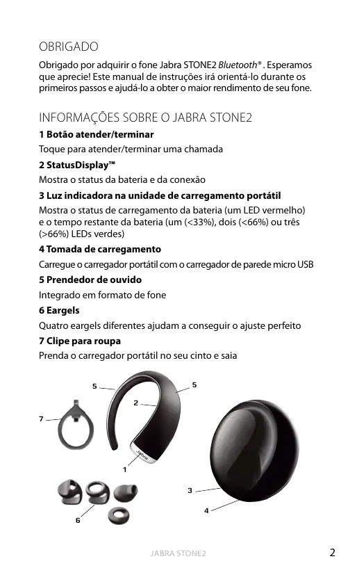 OBRIGADO Obrigado por adquirir o fone Jabra STONE2 Bluetooth® . Esperamos que aprecie! Este manual de instruções irá orientá-lo durante os primeiros passos e ajudá-lo a obter o maior rendimento de seu fone.