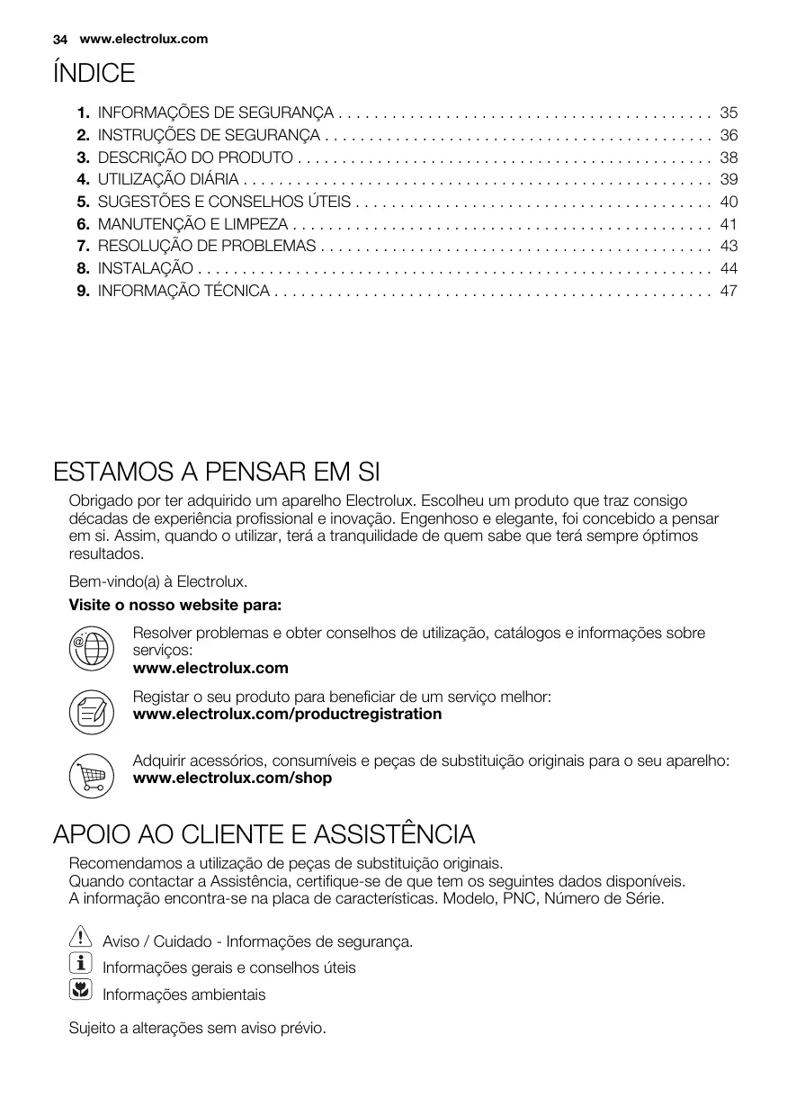Obrigado por ter adquirido um aparelho Electrolux. Escolheu um produto que traz consigo décadas de experiência profissional e inovação. Engenhoso e elegante, foi concebido a pensar em si. Assim, quando o utilizar, terá a tranquilidade de quem sabe que terá sempre óptimos resultados. Bem-vindo(a) à Electrolux. Visite o nosso website para: Resolver problemas e obter conselhos de utilização, catálogos e informações sobre serviços: www.electrolux.com Registar o seu produto para beneficiar de um serviço melhor: www.electrolux.com/productregistration Adquirir acessórios, consumíveis e peças de substituição originais para o seu aparelho: www.electrolux.com/shop