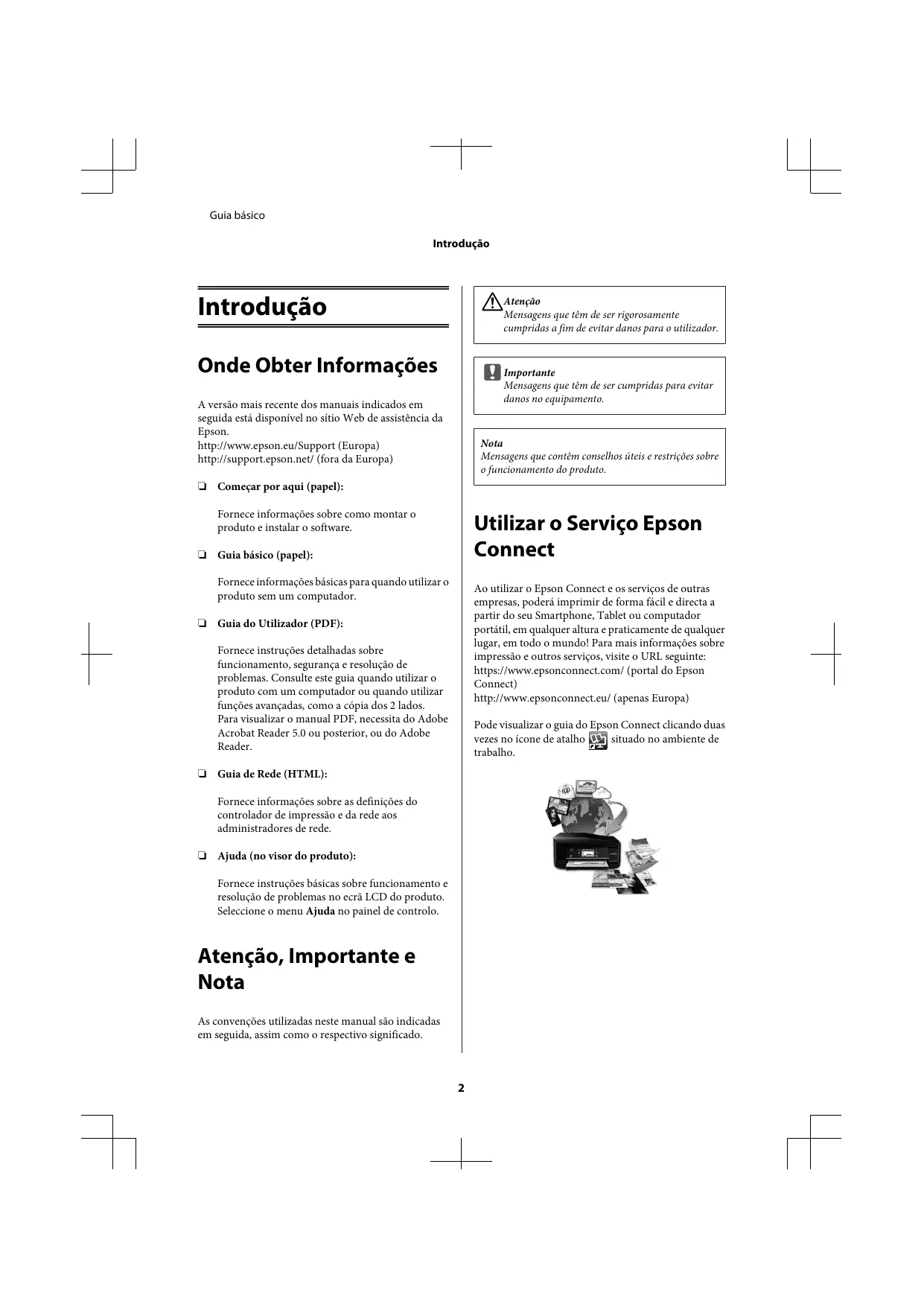 Guia básico Introdução !Atenção Mensagens que têm de ser rigorosamente Introdução cumpridas a fim de evitar danos para o utilizador. Onde Obter Informações Importante c Mensagens que têm de ser cumpridas para evitar danos no equipamento. A versão mais recente dos manuais indicados em seguida está disponível no sítio Web de assistência da Epson. http://www.epson.eu/Support (Europa) http://support.epson.net/ (fora da Europa) Nota Mensagens que contêm conselhos úteis e restrições sobre o funcionamento do produto. ❏ Começar por aqui (papel): Fornece informações sobre como montar o produto e instalar o software. Utilizar o Serviço Epson Connect ❏ Guia básico (papel): Fornece informações básicas para quando utilizar o produto sem um computador. Ao utilizar o Epson Connect e os serviços de outras empresas, poderá imprimir de forma fácil e directa a partir do seu Smartphone, Tablet ou computador portátil, em qualquer altura e praticamente de qualquer lugar, em todo o mundo! Para mais informações sobre impressão e outros serviços, visite o URL seguinte: https://www.epsonconnect.com/ (portal do Epson Connect) http://www.epsonconnect.eu/ (apenas Europa) ❏ Guia do Utilizador (PDF): Fornece instruções detalhadas sobre funcionamento, segurança e resolução de problemas. Consulte este guia quando utilizar o produto com um computador ou quando utilizar funções avançadas, como a cópia dos 2 lados. Para visualizar o manual PDF, necessita do Adobe Acrobat Reader 5.0 ou posterior, ou do Adobe Reader. Pode visualizar o guia do Epson Connect clicando duas vezes no ícone de atalho situado no ambiente de trabalho. ❏ Guia de Rede (HTML): Fornece informações sobre as definições do controlador de impressão e da rede aos administradores de rede. ❏ Ajuda (no visor do produto): Fornece instruções básicas sobre funcionamento e resolução de problemas no ecrã LCD do produto. Seleccione o menu Ajuda no painel de controlo. Atenção, Importante e Nota As convenções utilizadas neste manual são indicadas em seguida, assim como o respectivo significado.