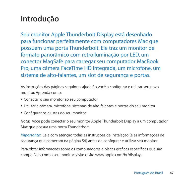 Español Introdução Seu monitor Apple Thunderbolt Display está desenhado para funcionar perfeitamente com computadores Mac que possuem uma porta Thunderbolt. Ele traz um monitor de formato panorâmico com retroiluminação por LED, um conector MagSafe para carregar seu computador MacBook Pro, uma câmera FaceTime HD integrada, um microfone, um sistema de alto-falantes, um slot de segurança e portas. As instruções das páginas seguintes ajudarão você a configurar e utilizar seu novo monitor. Aprenda como: ÂÂ Conectar o seu monitor ao seu computador ÂÂ Utilizar a câmera, microfone, sistemas de alto-falantes e portas do seu monitor ÂÂ Configurar os ajustes do seu monitor Nota: Você pode conectar o seu monitor Apple Thunderbolt Display a um computador Mac que possua uma porta Thunderbolt. Importante: Leia com atenção todas as instruções de instalação (e as informações de segurança que começam na página 54) antes de configurar e utilizar seu monitor. Para obter informações sobre os computadores e placas gráficas específicas que são compatíveis com o seu monitor, visite o site www.apple.com/br/displays. Português do Brasil