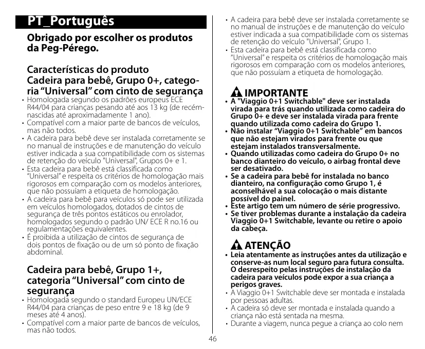 • Leia atentamente as instruções antes da utilização e conserve-as num local seguro para futura consulta. O desrespeito pelas instruções de instalação da cadeira para veículos pode expor a sua criança a perigos graves. • A Viaggio 0+1 Switchable deve ser montada e instalada por pessoas adultas. • A cadeira só deve ser montada e instalada quando a criança não está sentada na mesma. • Durante a viagem, nunca pegue a criança ao colo nem