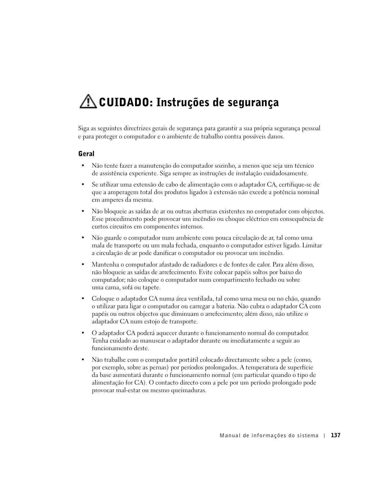 Não trabalhe com o computador portátil colocado directamente sobre a pele (como, por exemplo, sobre as pernas) por períodos prolongados. A temperatura de superfície da base aumentará durante o funcionamento normal (em particular quando o tipo de alimentação for CA). O contacto directo com a pele por um período prolongado pode provocar mal-estar ou mesmo queimaduras. Manual de infor mações do sistema