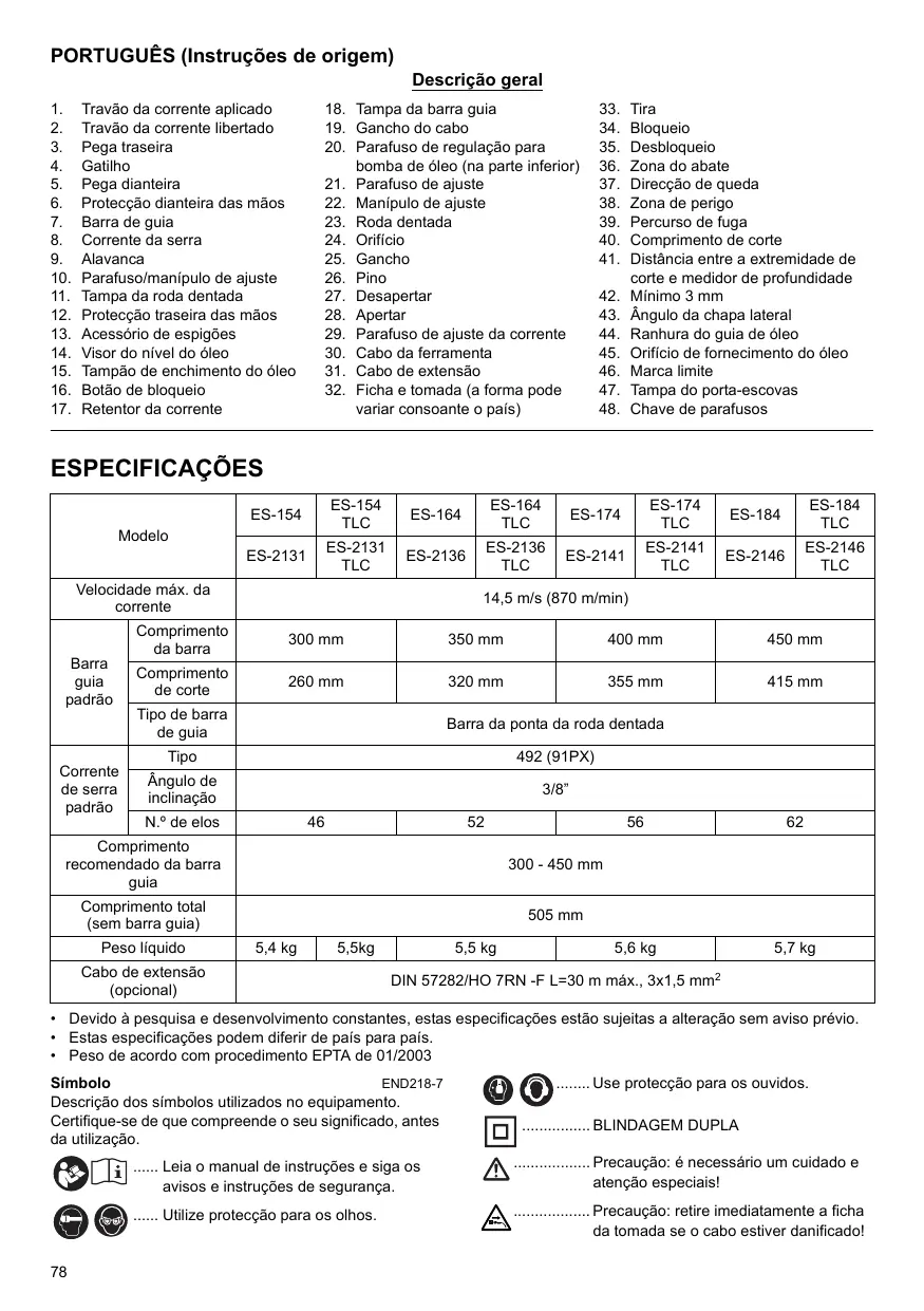 • Devido à pesquisa e desenvolvimento constantes, estas especificações estão sujeitas a alteração sem aviso prévio. • Estas especificações podem diferir de país para país. • Peso de acordo com procedimento EPTA de 01/2003 Símbolo END218-7 Descrição dos símbolos utilizados no equipamento. Certifique-se de que compreende o seu significado, antes da utilização.