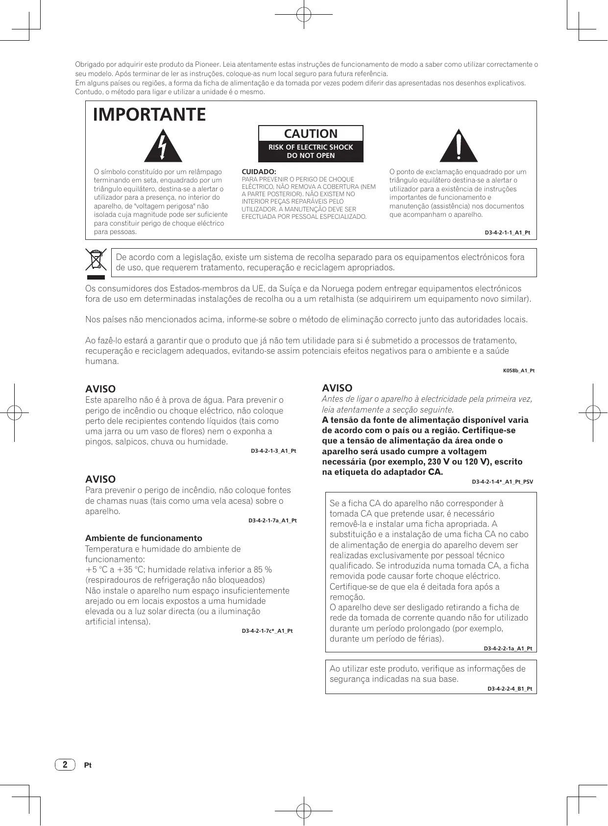 Obrigado por adquirir este produto da Pioneer. Leia atentamente estas instruções de funcionamento de modo a saber como utilizar correctamente o seu modelo. Após terminar de ler as instruções, coloque-as num local seguro para futura referência. Em alguns países ou regiões, a forma da ficha de alimentação e da tomada por vezes podem diferir das apresentadas nos desenhos explicativos. Contudo, o método para ligar e utilizar a unidade é o mesmo. IMPORTANTE CAUTION