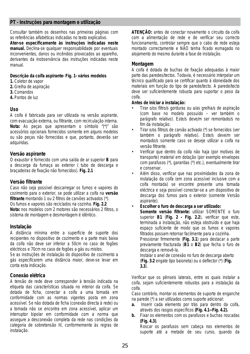 Uso A coifa é fabricada para ser utilizada na versão aspirante, com evacuação externa, ou filtrante, com recirculação interna. Nota: As peças que apresentam o símbolo “(*)” são acessórios opcionais fornecidos somente em alguns modelos ou são peças não fornecidas e que, portanto, deverão ser adquiridas. Versão aspirante O exaustor é fornecido com uma saída de ar superior B para a descarga da fumaça ao exterior ( tubo de descarga e braçadeiras de fixação não fornecidos). Fig. 2.1 Versão filtrante Caso não seja possível descarregar os fumos e vapores do cozimento para o exterior, se pode utilizar a coifa na versão filtrante montando 1 ou 2 filtros de carvões activados (*). Os fumos e vapores são reciclados na cozinha. Fig. 2.2 Nota: nos modelos com 2 motores são necessários 2 filtros, o sistema de montagem e desmontagem é idêntico. Instalação A distância mínima entre a superfície de suporte dos recipientes no dispositivo de cozimento e a parte mais baixa da coifa não deve ser inferior a 50cm no caso de fogões eléctricos e 70cm no caso de fogões a gás ou mistos. Se as instruções de instalação do dispositivo de cozimento a gás especificarem uma distância maior, deve-se levar em conta esta indicação. Conexão elétrica Verificar que os pênseis laterais, entre os quais instalar a coifa, sejam suficientemente robustos para a instalação da coifa. Caso contrário, montar os elementos de suporte de enganche na parede (*) a ser utilizados como suporte adicional: a. Inserir cada elemento por trás para dentro da coifa, através dos rasgos específicos (Fig. 4.1--Fig. 4.2). b. Fixar os elementos com os parafusos e buchas roscadas (Fig. 4.3). Roscar os parafusos sem cabeça nos elementos de suporte até a metade de seu curso, quando da A tensão de rede deve corresponder à tensão indicada na etiqueta das características situada no interior da coifa. Se dotada de ficha, conectar a coifa a uma tomada em conformidade com as normas vigentes posta em zona acessível. Se não dotada de ficha (conexão directa à rede) ou a tomada não se encontra em zona acessível, aplicar um interruptor bipolar em conformidade com a norma que assegure a desconexão completa da rede nas condições da categoria de sobretensão III, conformemente às regras de instalação.