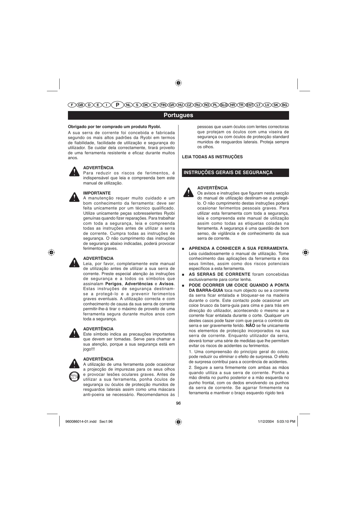 ADVERTÊNCIA Os avisos e instruções que figuram nesta secção do manual de utilização destinam-se a protegêlo. O não cumprimento destas instruções poderá ocasionar ferimentos pessoais graves. Para utilizar esta ferramenta com toda a segurança, leia e compreenda este manual de utilização assim como todas as etiquetas coladas na ferramenta. A segurança é uma questão de bom senso, de vigilância e de conhecimento da sua serra de corrente. IMPORTANTE A manutenção requer muito cuidado e um bom conhecimento da ferramenta: deve ser feita unicamente por um técnico qualificado. Utilize unicamente peças sobresselentes Ryobi genuínas quando fizer reparações. Para trabalhar com toda a segurança, leia e compreenda todas as instruções antes de utilizar a serra de corrente. Cumpra todas as instruções de segurança. O não cumprimento das instruções de segurança abaixo indicadas, poderá provocar ferimentos graves.