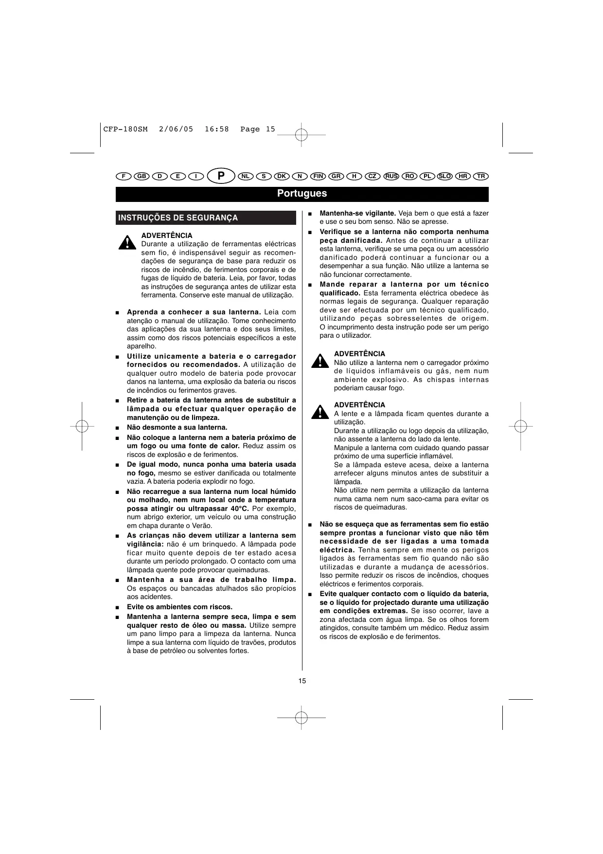 sem fio, 6 indispensävel seguir as recomen- daçôes de segurança de base para reduzir os riscos de incéndio, de ferimentos corporais e de fugas de liquido de bateria. Leia, por favor, todas as instruçôes de segurança antes de utilizar esta ferramenta. Conserve este manual de utilizaçäo.
