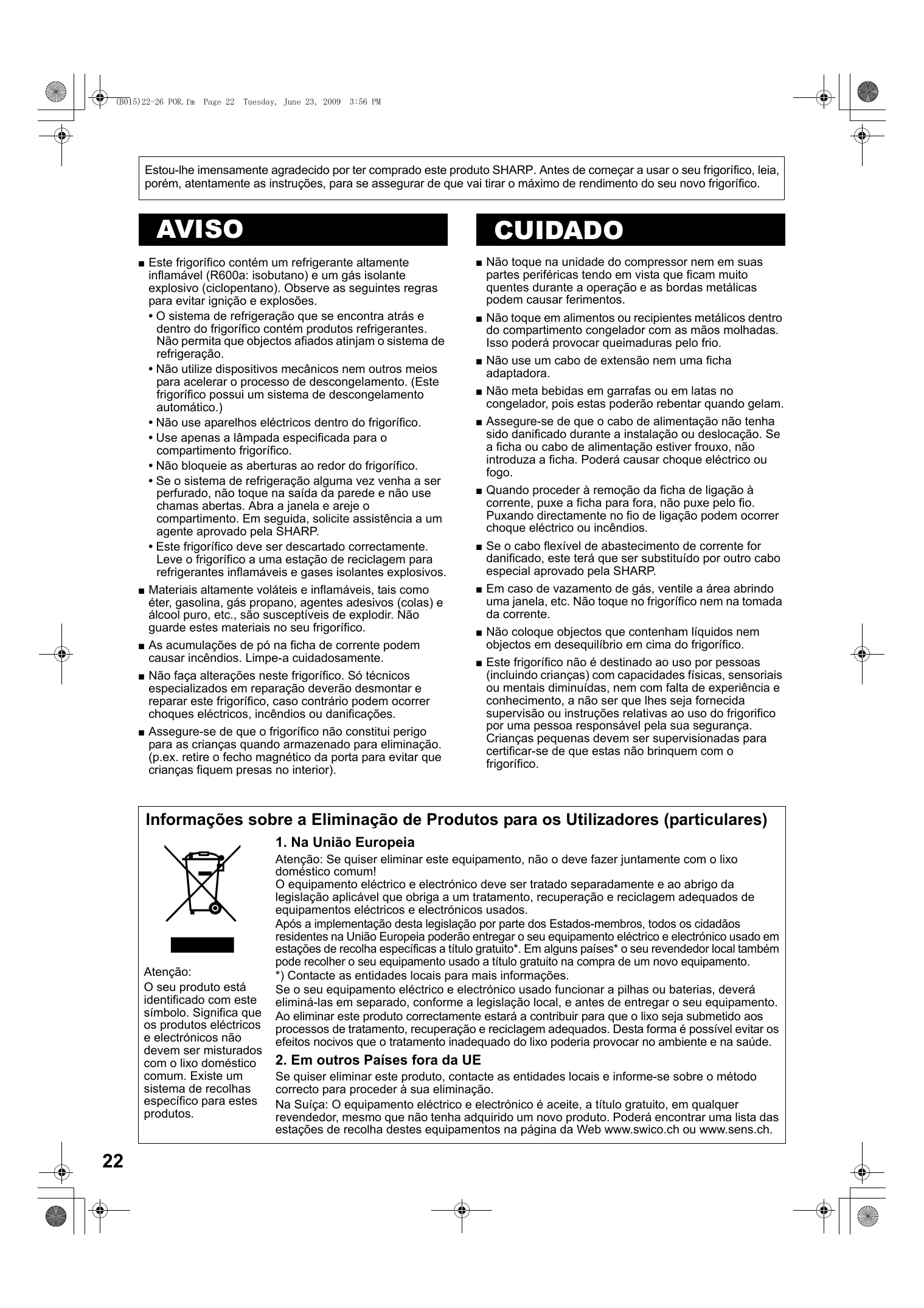 (B015)22-26 POR.fm Page 22 Tuesday, June 23, 2009 3:56 PM Estou-lhe imensamente agradecido por ter comprado este produto SHARP. Antes de começar a usar o seu frigorífico, leia, porém, atentamente as instruções, para se assegurar de que vai tirar o máximo de rendimento do seu novo frigorífico. AVISO