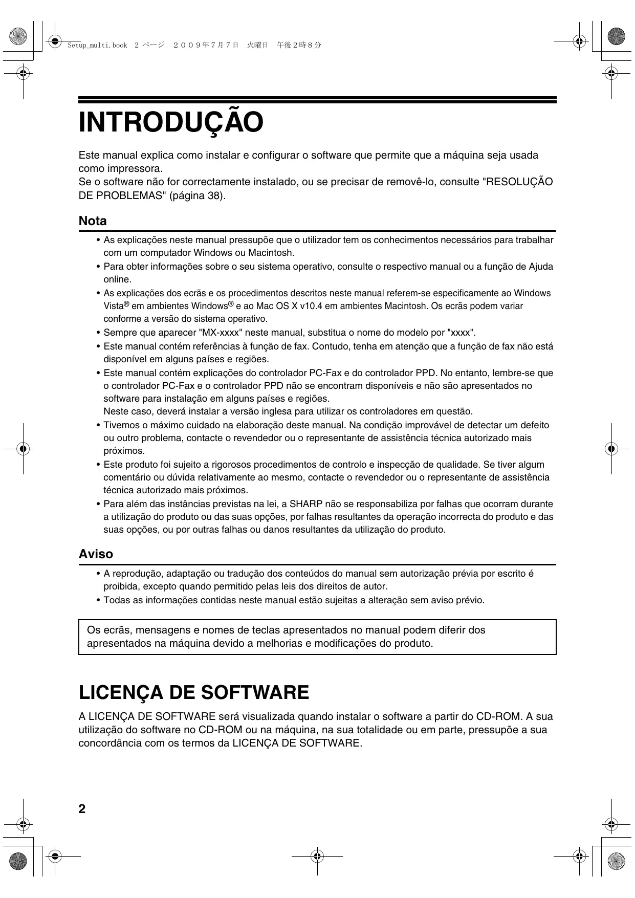 INTRODUÇÃO Este manual explica como instalar e configurar o software que permite que a máquina seja usada como impressora. Se o software não for correctamente instalado, ou se precisar de removê-lo, consulte "RESOLUÇÃO DE PROBLEMAS" (página 38). Nota