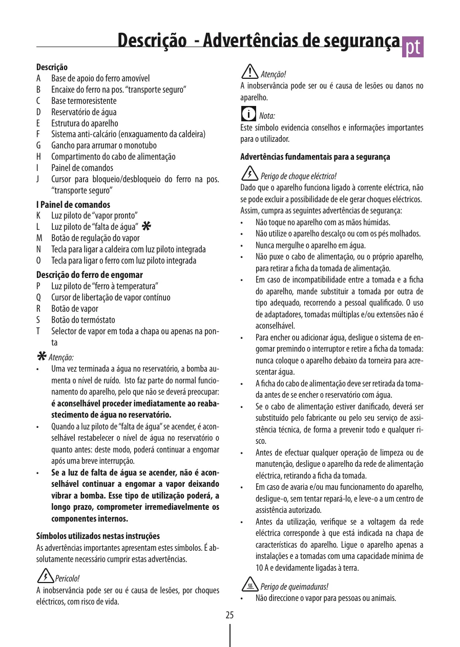 Descrição - Advertências de segurança pt Descrição Atenção! A inobservância pode ser ou é causa de lesões ou danos no aparelho. A Base de apoio do ferro amovível B Encaixe do ferro na pos. “transporte seguro” C Base termoresistente D Reservatório de água E Estrutura do aparelho F Sistema anti-calcário (enxaguamento da caldeira) G Gancho para arrumar o monotubo H Compartimento do cabo de alimentação I Painel de comandos J Cursor para bloqueio/desbloqueio do ferro na pos. “transporte seguro” I Painel de comandos K Luz piloto de “vapor pronto” L Luz piloto de “falta de água” M Botão de regulação do vapor N Tecla para ligar a caldeira com luz piloto integrada O Tecla para ligar o ferro com luz piloto integrada Descrição do ferro de engomar P Luz piloto de “ferro à temperatura” Q Cursor de libertação de vapor contínuo R Botão de vapor S Botão do termóstato T Selector de vapor em toda a chapa ou apenas na ponta Nota: Este símbolo evidencia conselhos e informações importantes para o utilizador. Advertências fundamentais para a segurança Perigo de choque eléctrico! Dado que o aparelho funciona ligado à corrente eléctrica, não se pode excluir a possibilidade de ele gerar choques eléctricos. Assim, cumpra as seguintes advertências de segurança:
