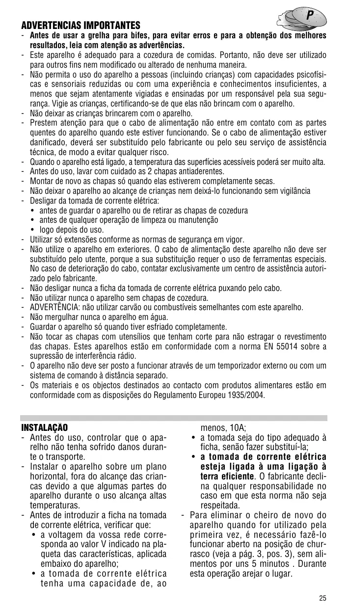 - logo depois do uso. - Utilizar só extensões conforme as normas de segurança em vigor. - Não utilize o aparelho em exteriores. O cabo de alimentação deste aparelho não deve ser substituído pelo utente, porque a sua substituição requer o uso de ferramentas especiais. No caso de deterioração do cabo, contatar exclusivamente um centro de assistência autorizado pelo fabricante. - Não desligar nunca a ficha da tomada de corrente elétrica puxando pelo cabo. - Não utilizar nunca o aparelho sem chapas de cozedura. - ADVERTÊNCIA: não utilizar carvão ou combustíveis semelhantes com este aparelho. - Não mergulhar nunca o aparelho em água. - Guardar o aparelho só quando tiver esfriado completamente. - Não tocar as chapas com utensílios que tenham corte para não estragar o revestimento das chapas. Estes aparelhos estão em conformidade com a norma EN 55014 sobre a supressão de interferência rádio. - O aparelho não deve ser posto a funcionar através de um temporizador externo ou com um sistema de comando à distância separado. - Os materiais e os objectos destinados ao contacto com produtos alimentares estão em conformidade com as disposições do Regulamento Europeu 1935/2004. INSTALAÇÃO - Antes do uso, controlar que o aparelho não tenha sofrido danos durante o transporte. - Instalar o aparelho sobre um plano horizontal, fora do alcançe das criancas devido a que algumas partes do aparelho durante o uso alcança altas temperaturas. - Antes de introduzir a ficha na tomada de corrente elétrica, verificar que: